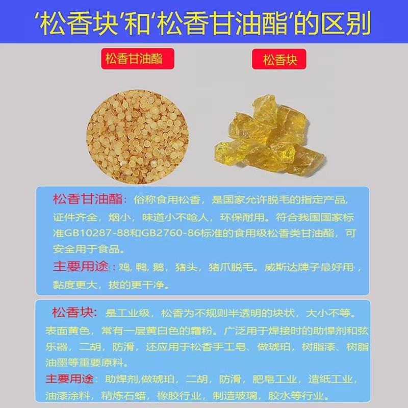 推荐理由:特级松香甘油酯食用松香拔毛食品级家禽鸡鸭鹅脱猪毛高粘度黄香
