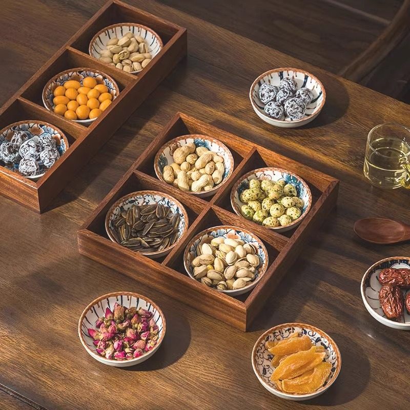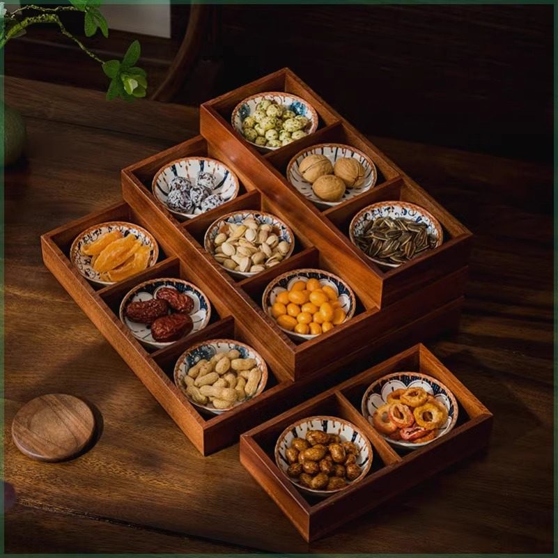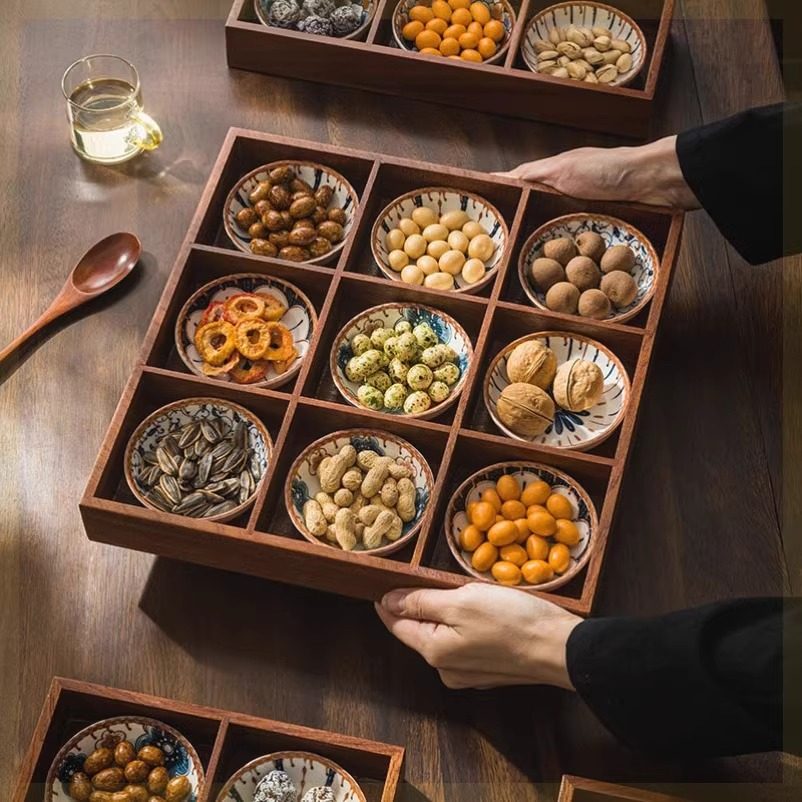 推荐理由:复古色九宫格家用木质托盘四宫格零食干果盘高档茶室会所点心拼盘