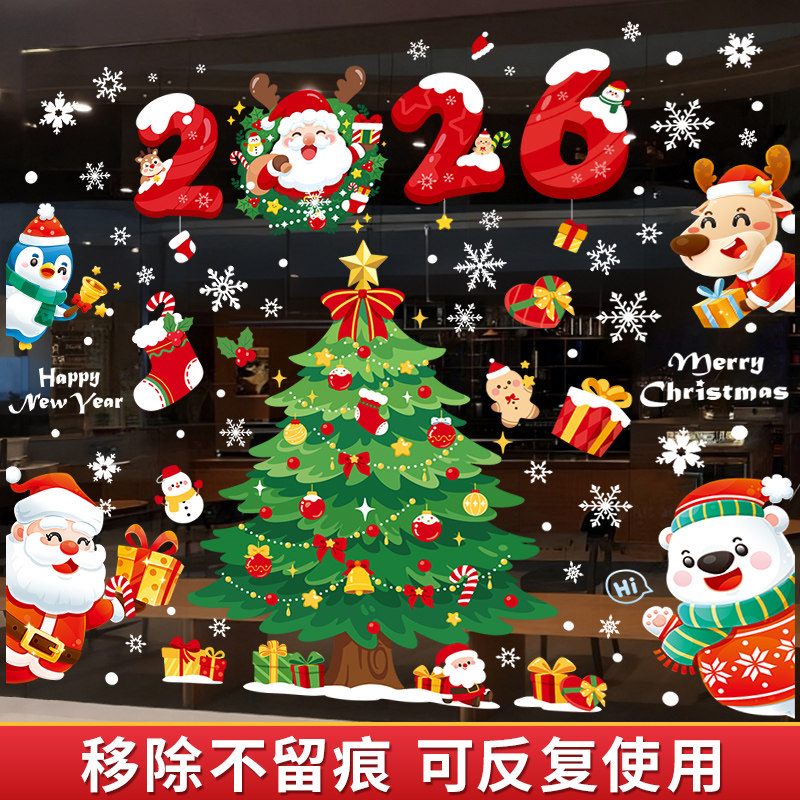 圣诞节玻璃门贴纸2026氛围场景布置圣诞老人树窗贴静电窗花装饰品