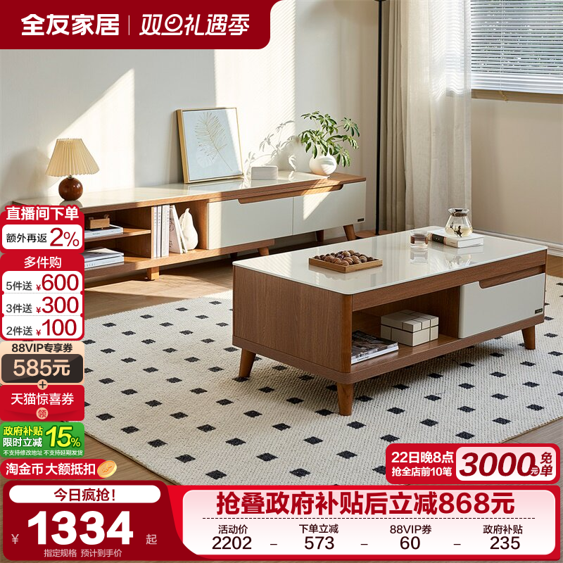全友家居新中式原木风玻璃茶几小户型客厅家用储物柜电视机柜组合