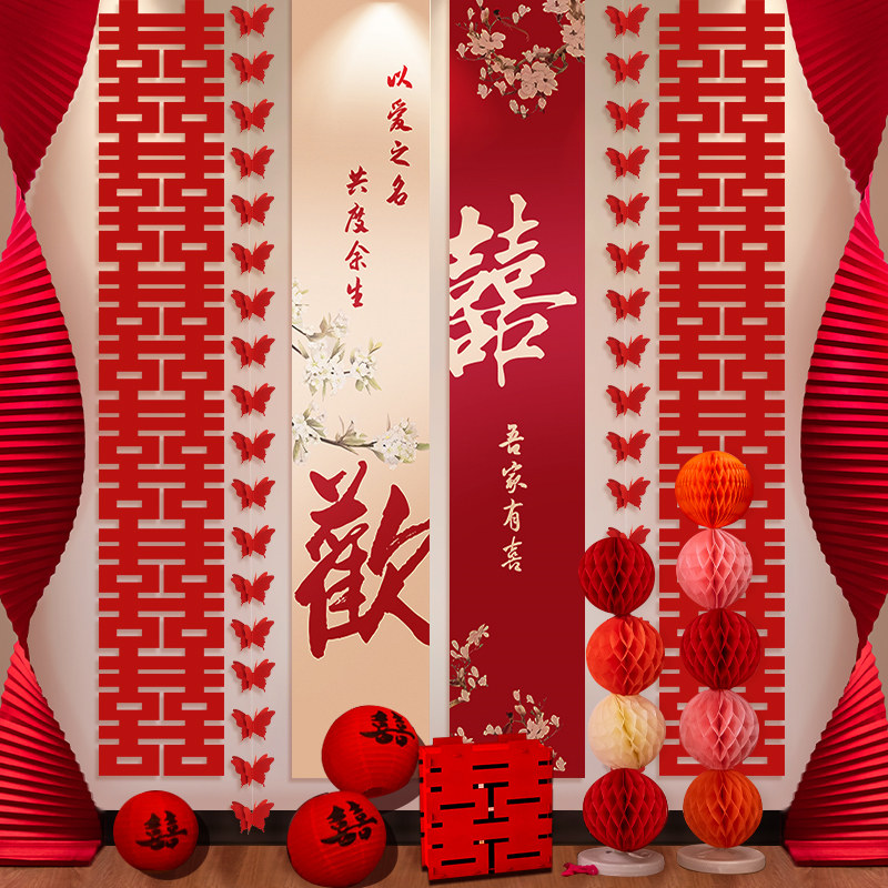 婚房布置套装结婚新房卧室床头装饰婚礼客厅背景阳台喜字拉花条幅