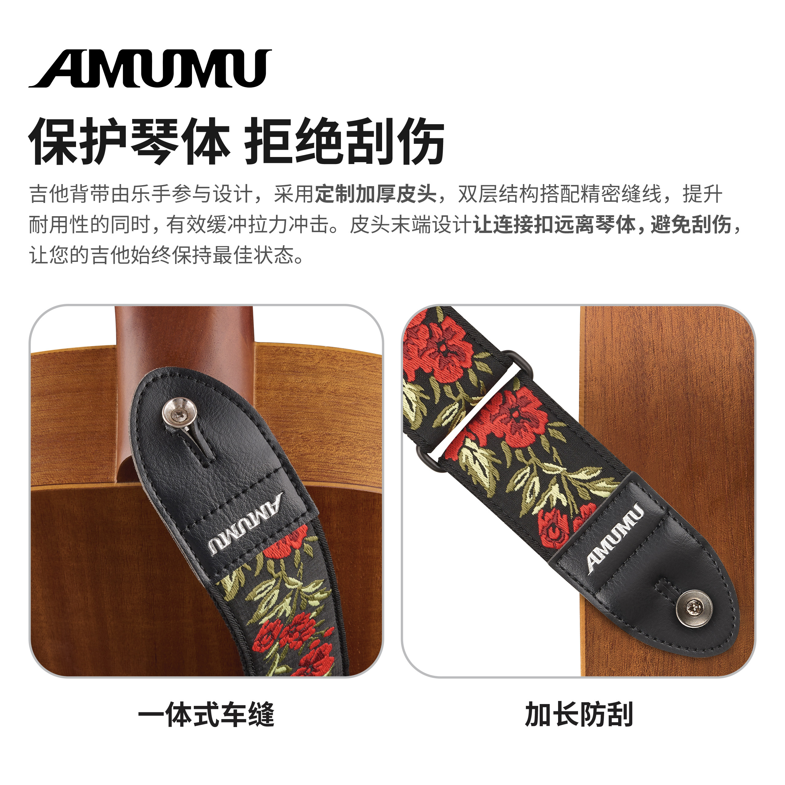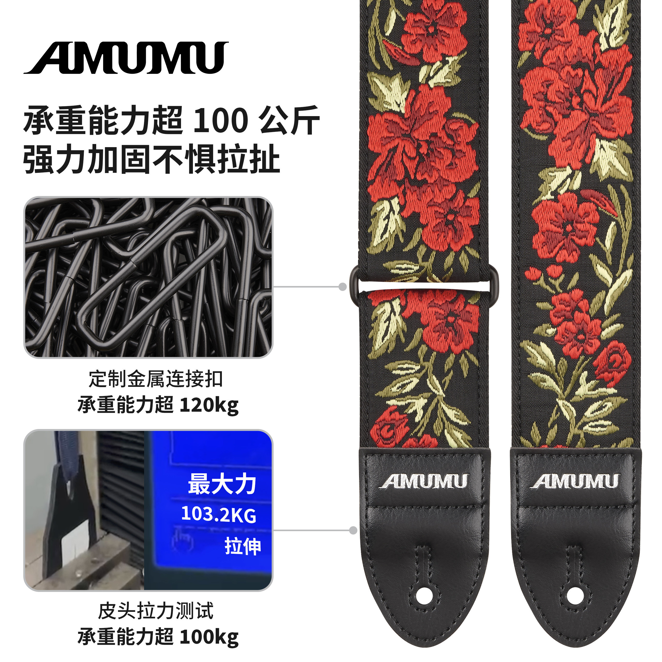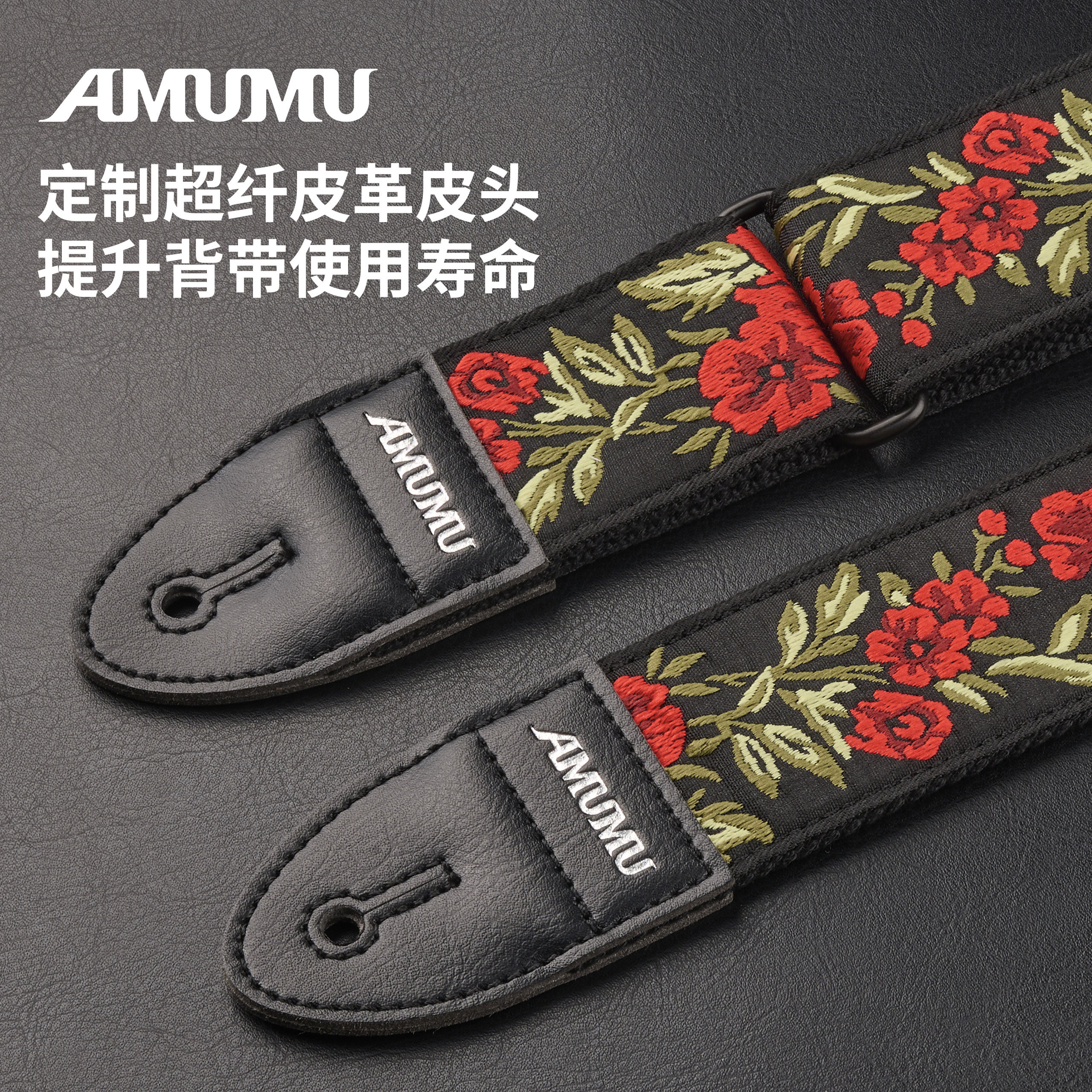 推荐理由:AMUMU刺绣吉他背带复古红玫瑰贝司斜挎民谣木电吉他琴带肩带通用