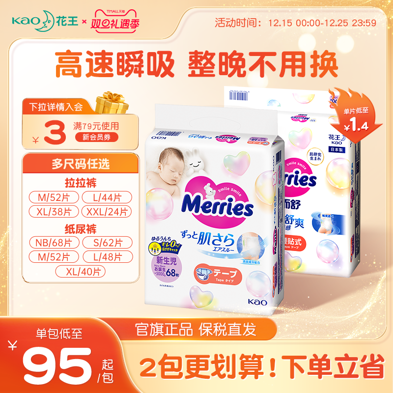 花王妙而舒纸尿裤新生婴儿NB/S/M/L/XL*2官方尿不湿布片拉拉裤
