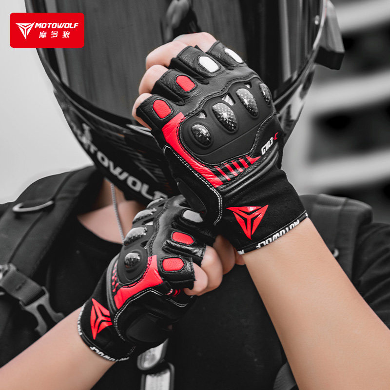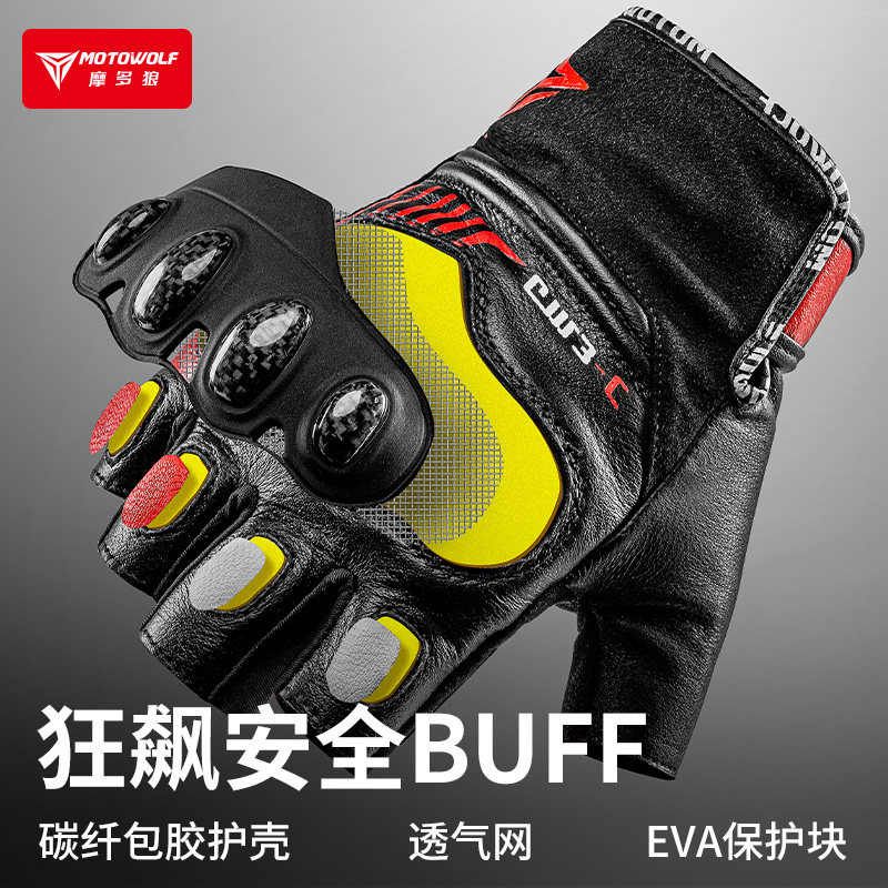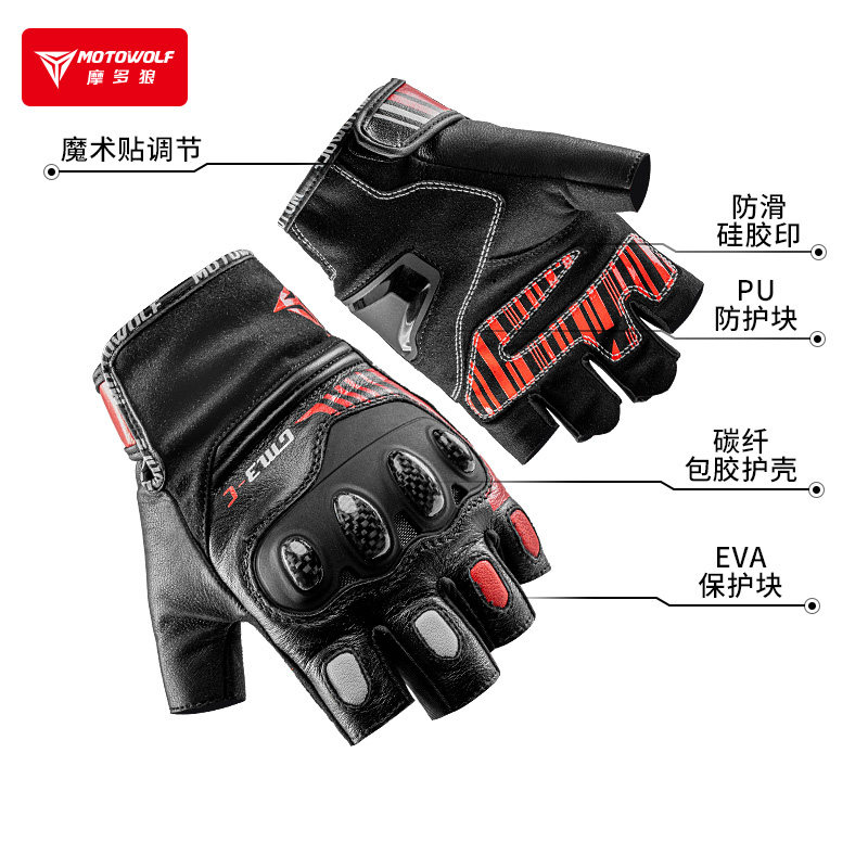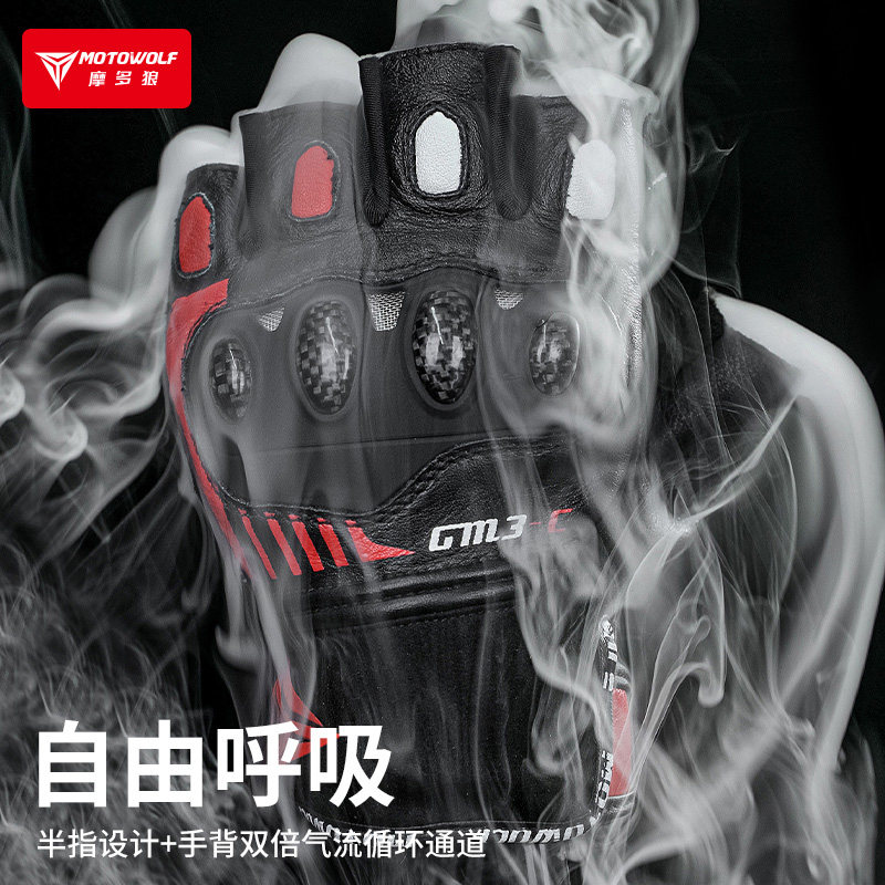 摩多狼半指手套夏季摩托车透气电动车机车骑行装备真皮碳纤维四季