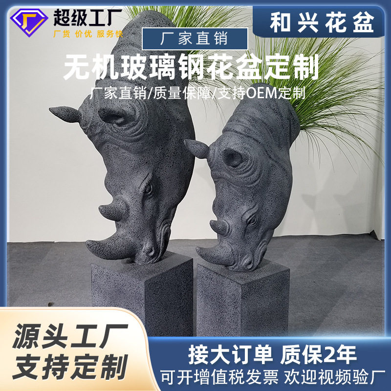 工厂直销户外犀牛头雕塑水泥园林大号花瓶客厅酒店玻璃钢花盆摆件