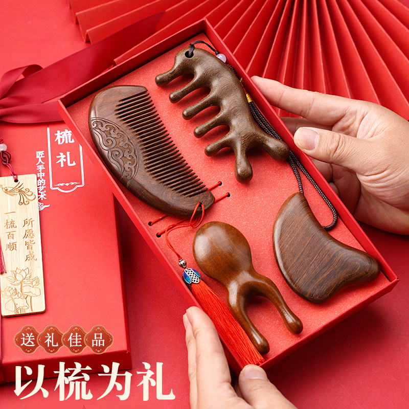 圣诞节元旦檀木梳子礼盒送长辈头部按摩梳定制刻字国风礼盒经络梳