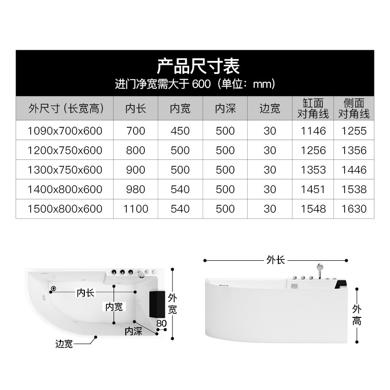 欧凯伦家用浴缸小户型亚克力冲浪按摩深泡无缝异形浴缸1.1-1.5米