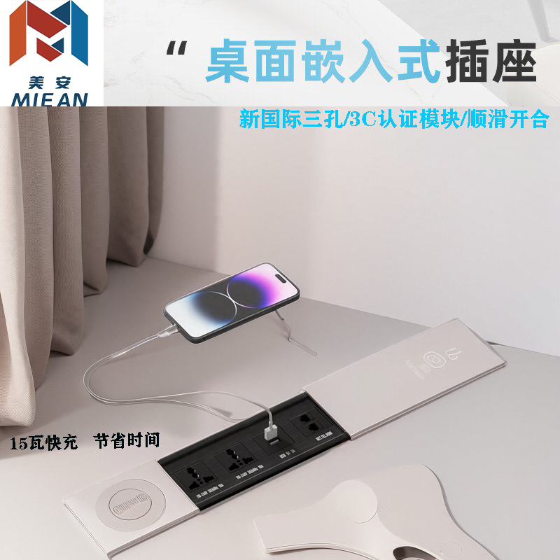 桌面嵌入式插座岛台无线充电侧滑插座台面滑盖式多功能隐藏式插排