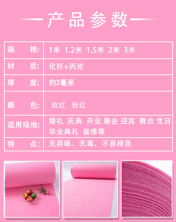 推荐理由:粉红色地毯结婚婚礼地毯婚庆一次性红地毯彩色玫红色展会开业地毯