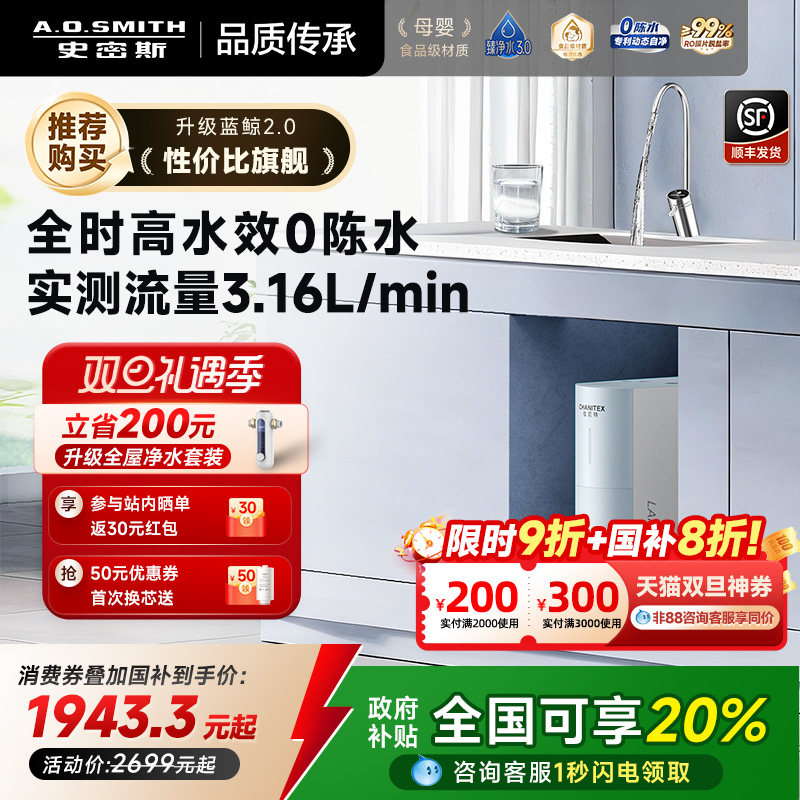 【全国补贴20%】AO史密斯佳尼特蓝鲸2.0家用直饮机净水器2500BM1