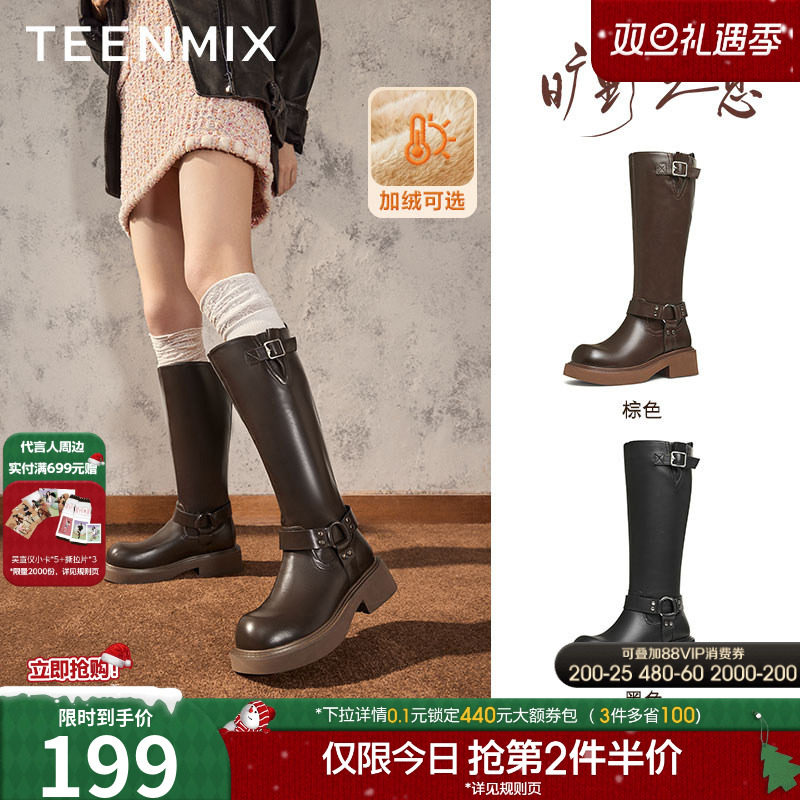 吴宣仪天美意千金靴复古厚底骑士靴加绒长靴女鞋子新款时装靴皮靴