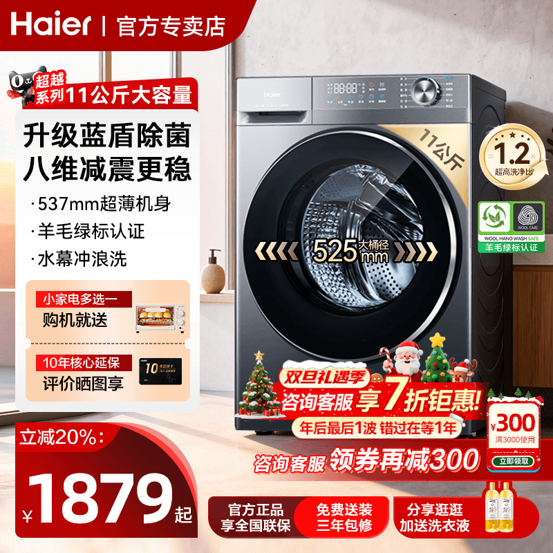 新品丨海尔洗衣机滚筒大容量11kg/10kg家用超薄全自动58e洗烘一体