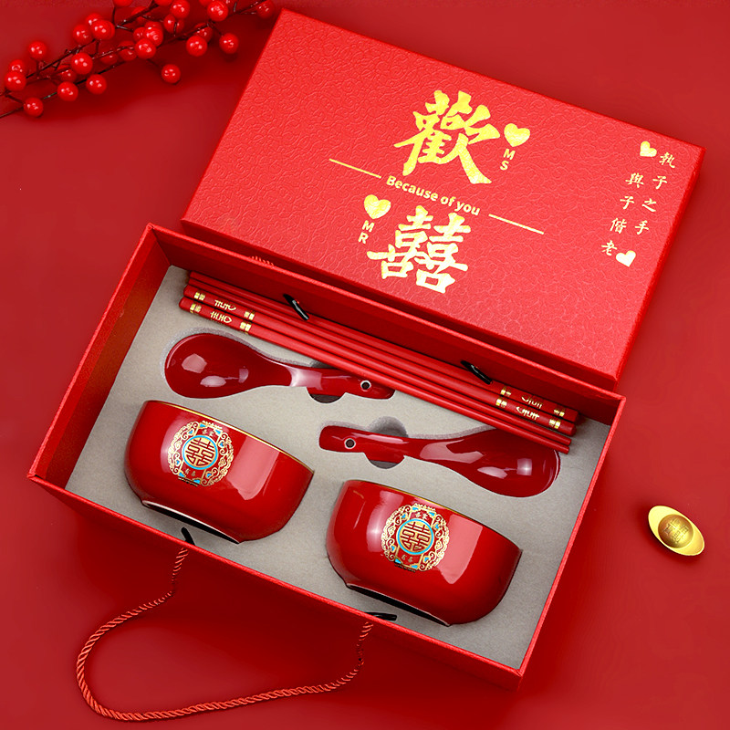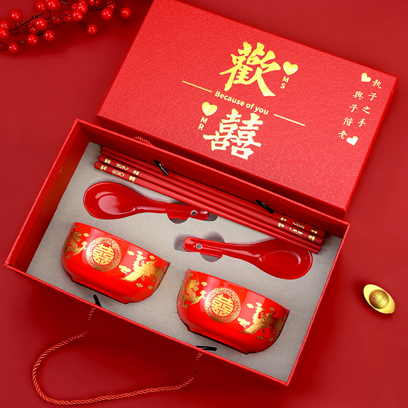 结婚手提礼盒装喜碗新娘家陪嫁用品套装婚礼酒红色陶瓷碗筷勺一对