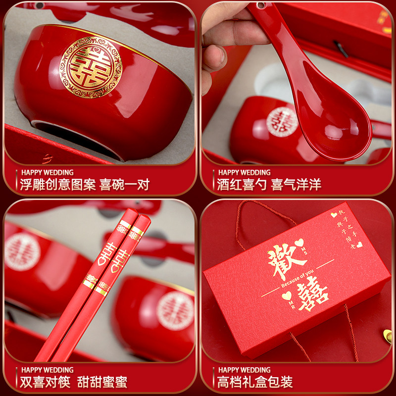 推荐理由:结婚手提礼盒装喜碗新娘家陪嫁用品套装婚礼酒红色陶瓷碗筷勺一对