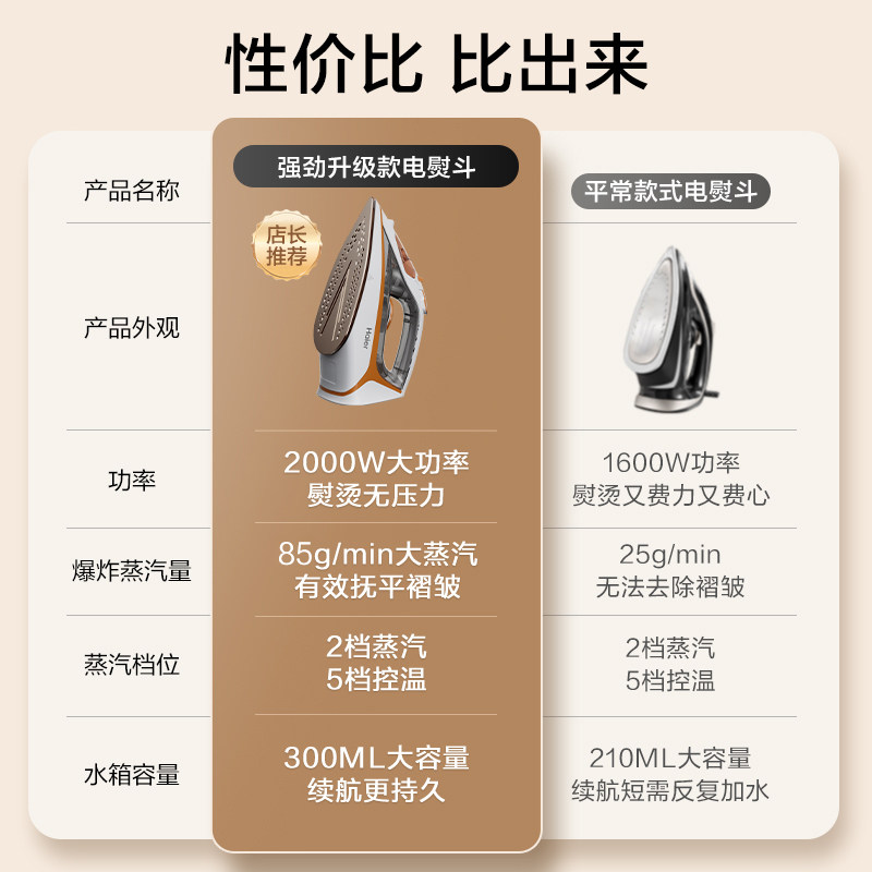 推荐理由:2000W爆炸蒸汽 5档温度调节即熨即穿