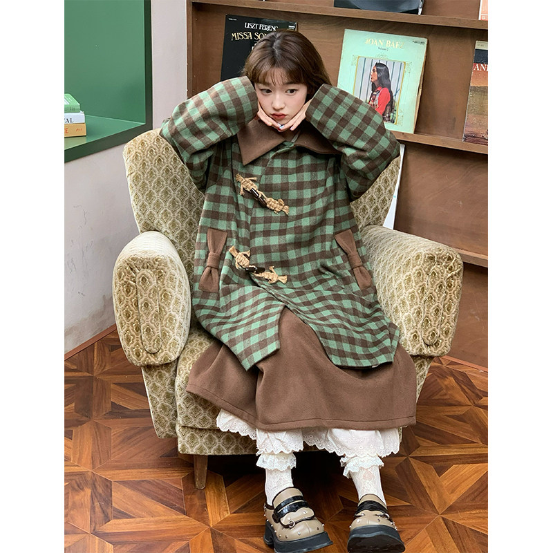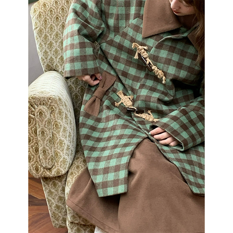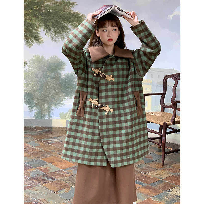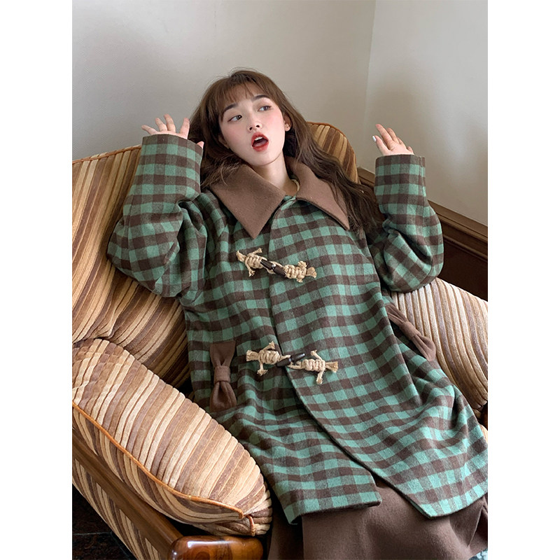 推荐理由:蛋包饭餐厅【抹茶曲奇】绿咖格子毛呢外套女春季中长款呢子大衣