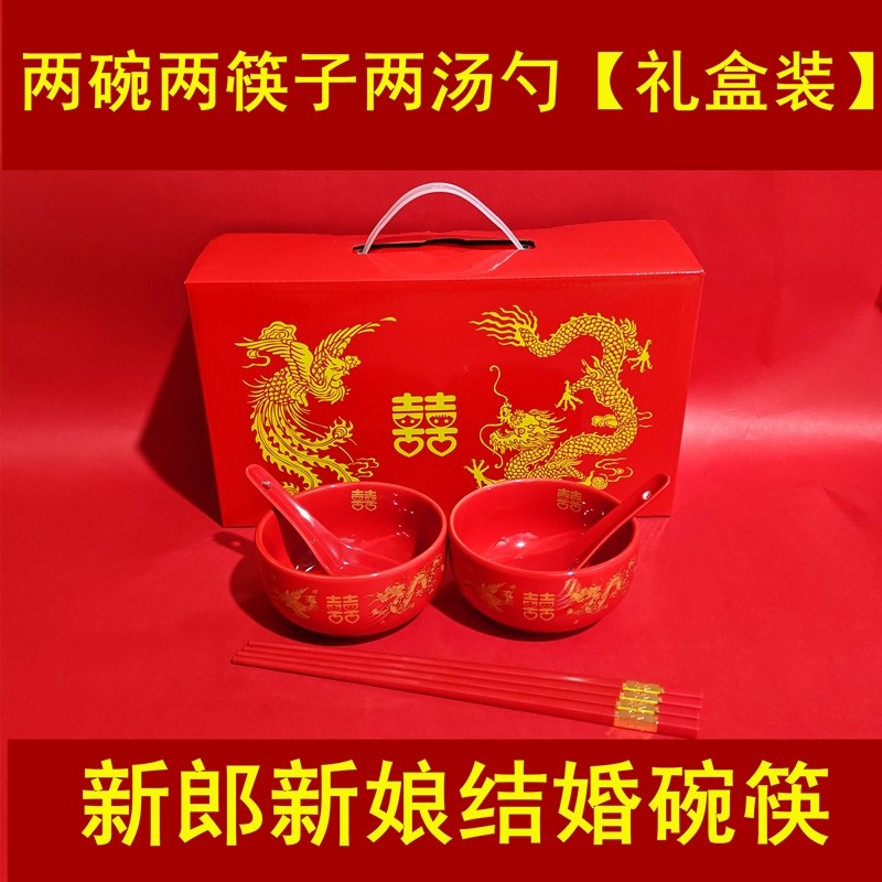 结婚陶瓷喜碗新娘新郎喜庆龙凤碗筷红汤勺新婚宴新人陪嫁喜碗餐具