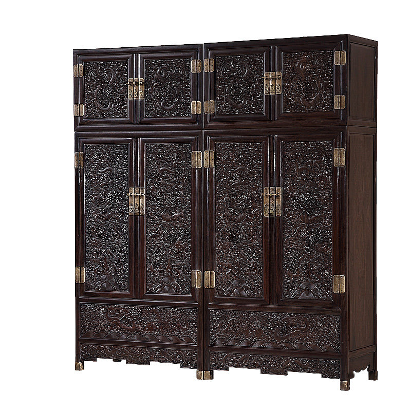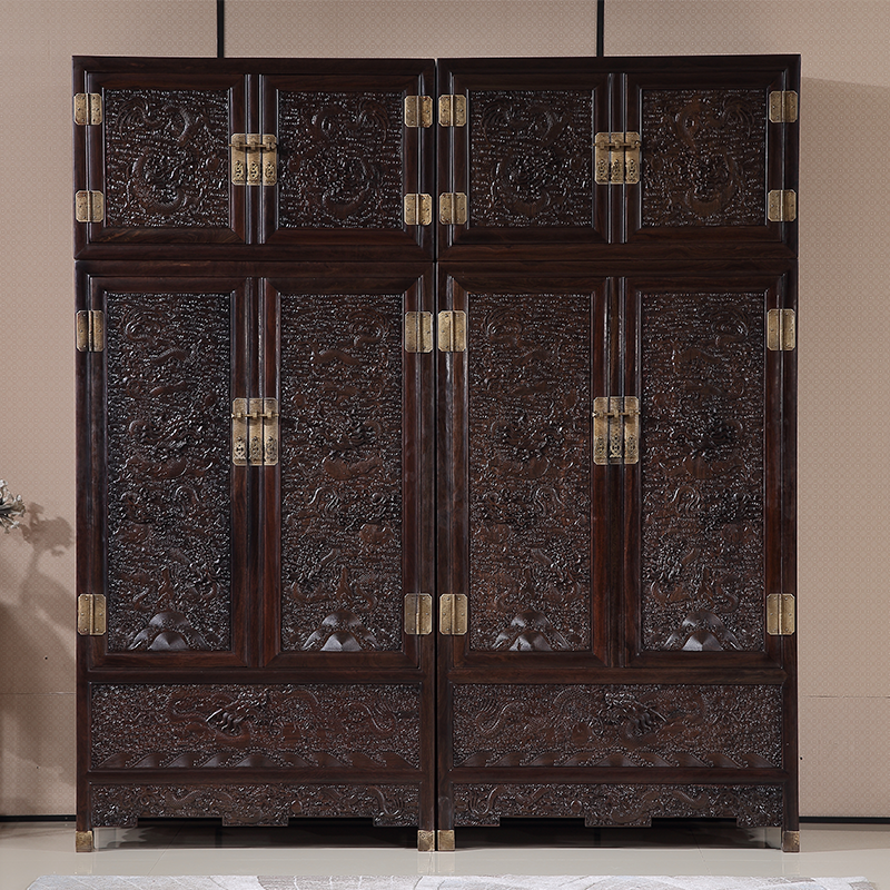 黑檀顶箱柜雕龙衣柜实木大衣柜衣橱四门中式仿古红木原木家用卧室