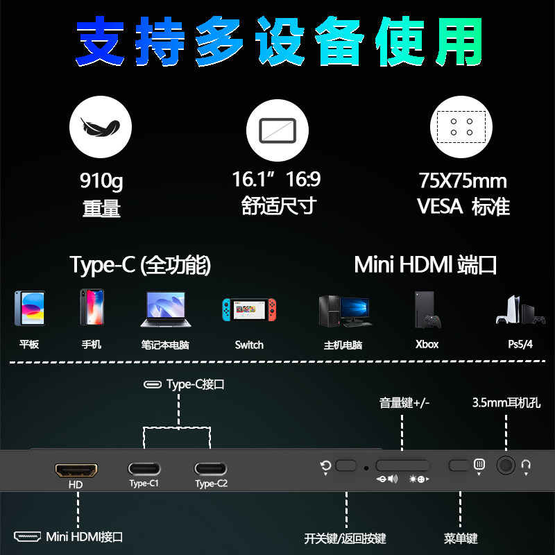 推荐理由:16.1便携显示器144hz高刷触摸游戏主机笔记本电脑副屏便携屏