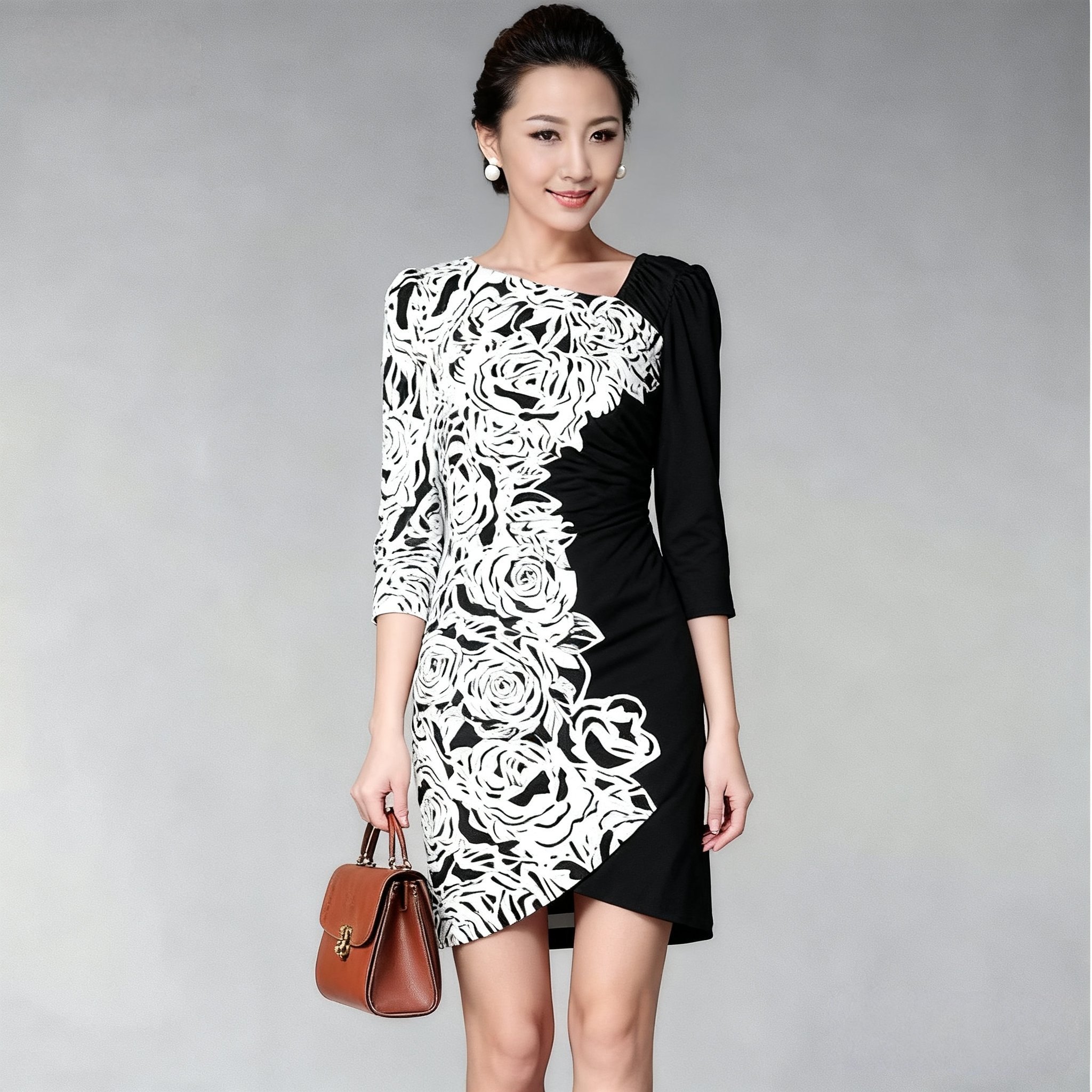 女2025新款优质修身显瘦黑白印花简约牛奶丝包臀针织大码连衣裙子