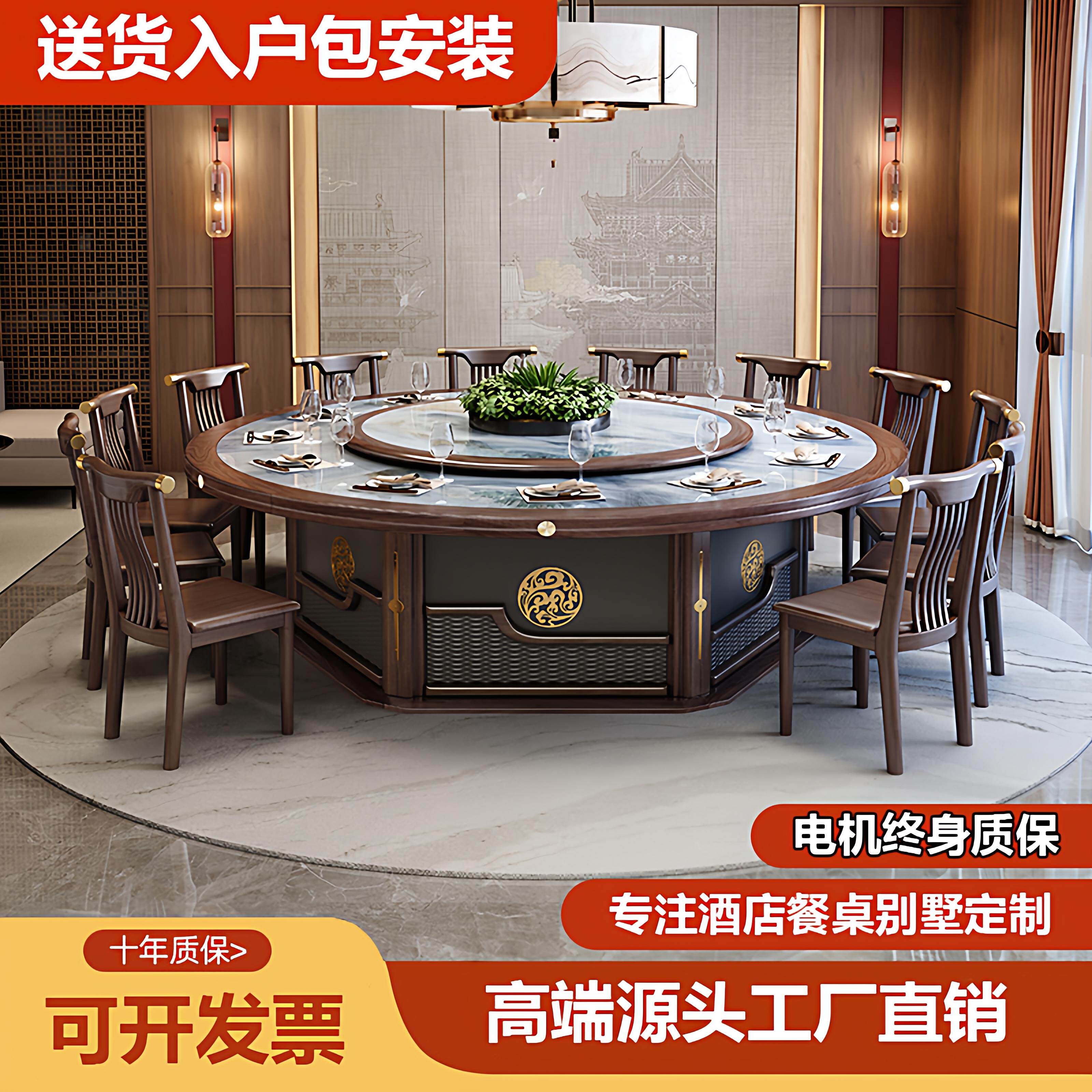 酒店电动餐桌大圆桌新中式实木岩板火锅桌子饭店会所包厢20人饭桌
