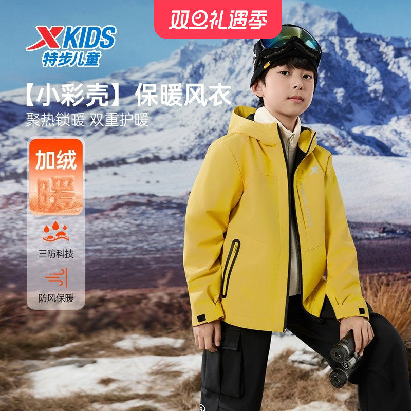 特步童装冬季新款男女童同款中大童运动休闲带帽儿童加绒保暖风衣