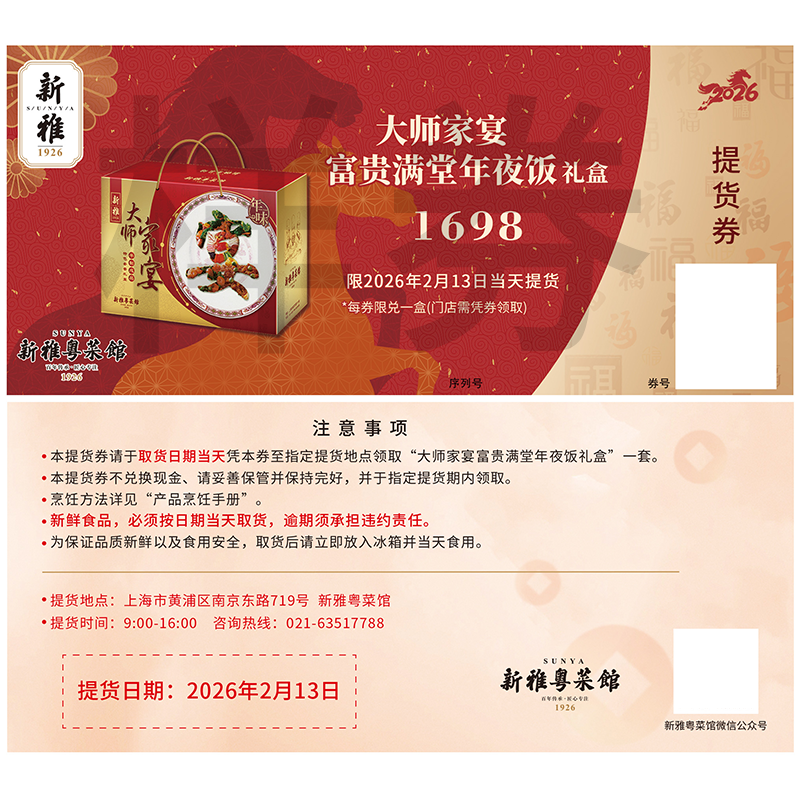 2026年新雅大师家宴B富贵满堂年夜饭提货卡半成品礼盒门店提货券