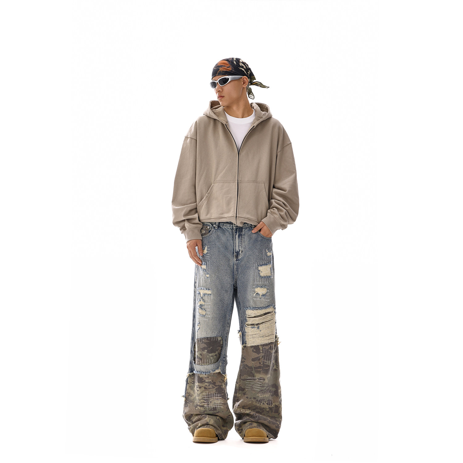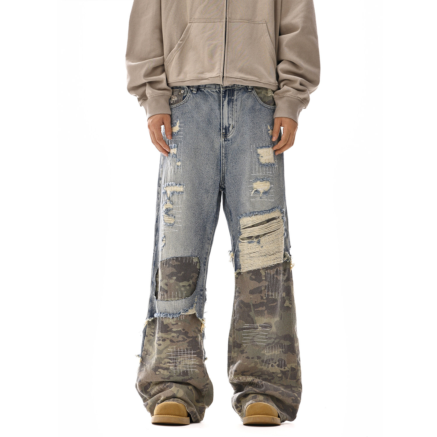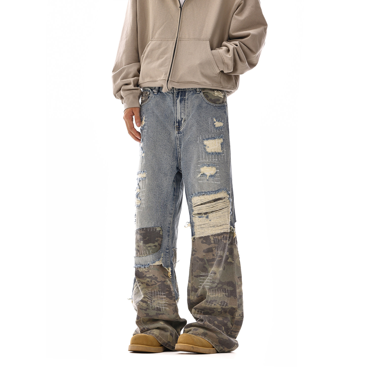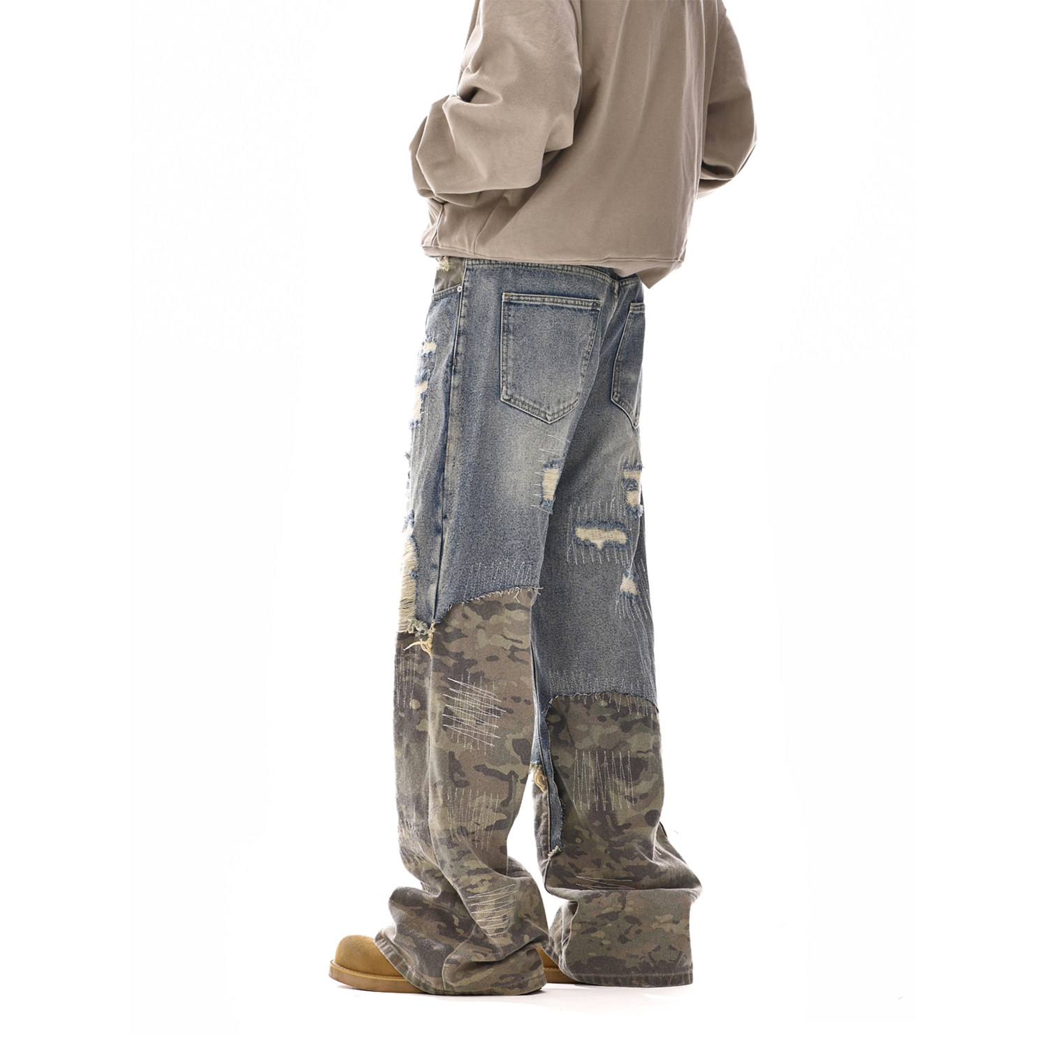 推荐理由:美式高街cleanfit牛仔拼接迷彩裤新款水洗破洞做旧微喇拖地长裤潮