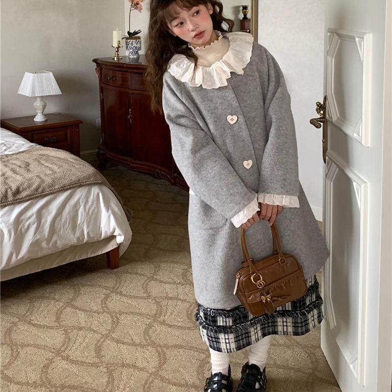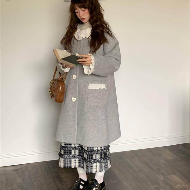 蛋包饭餐厅小香风复古灰色毛呢外套女荷叶领设计感千金小姐大衣
