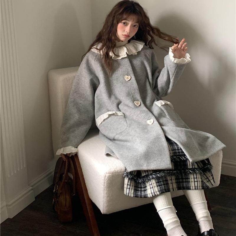 推荐理由:蛋包饭餐厅小香风复古灰色毛呢外套女荷叶领设计感千金小姐大衣