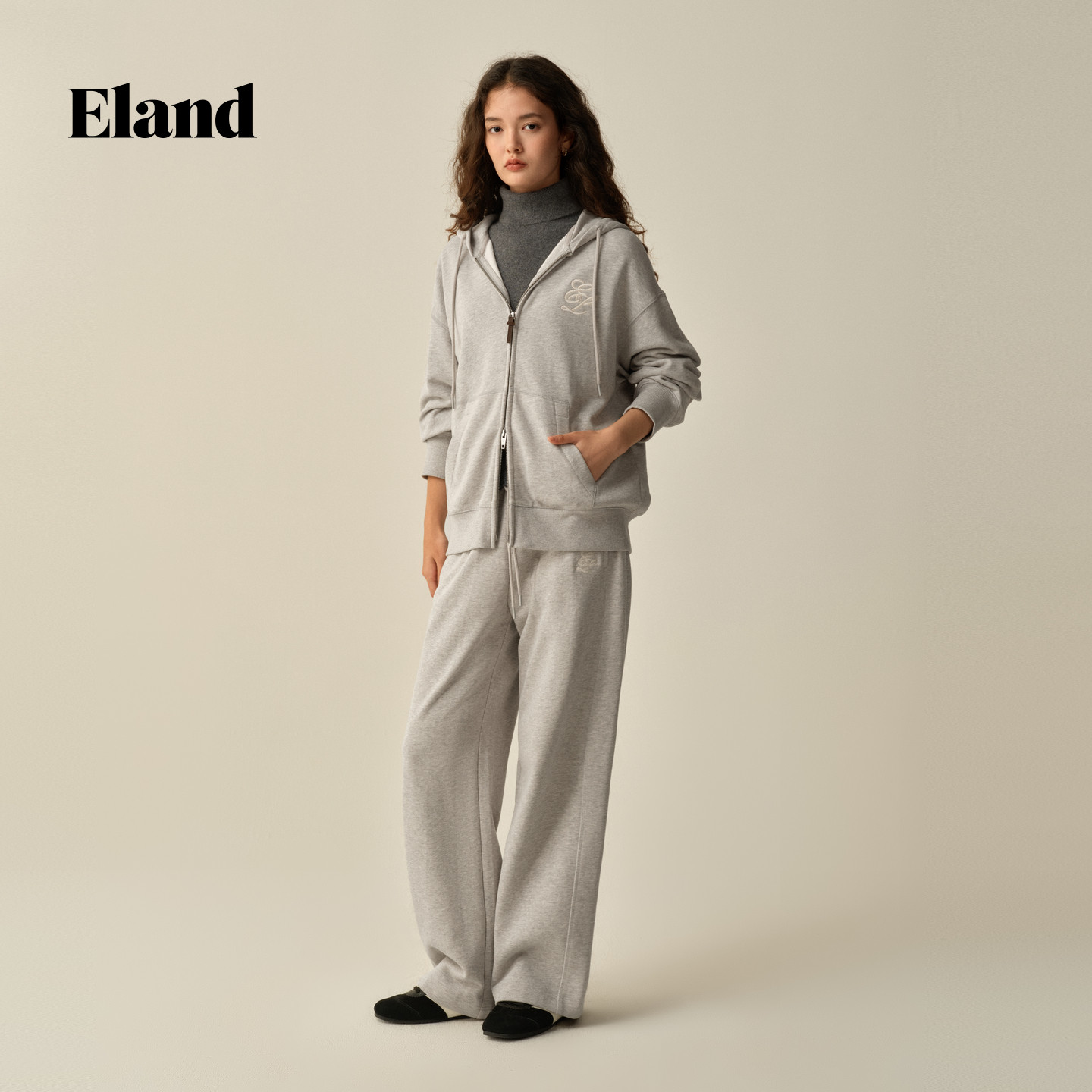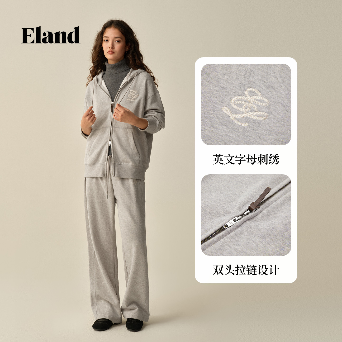 【100%棉】Eland衣恋卫衣女时尚连帽拉链宽松外套2025冬季新款