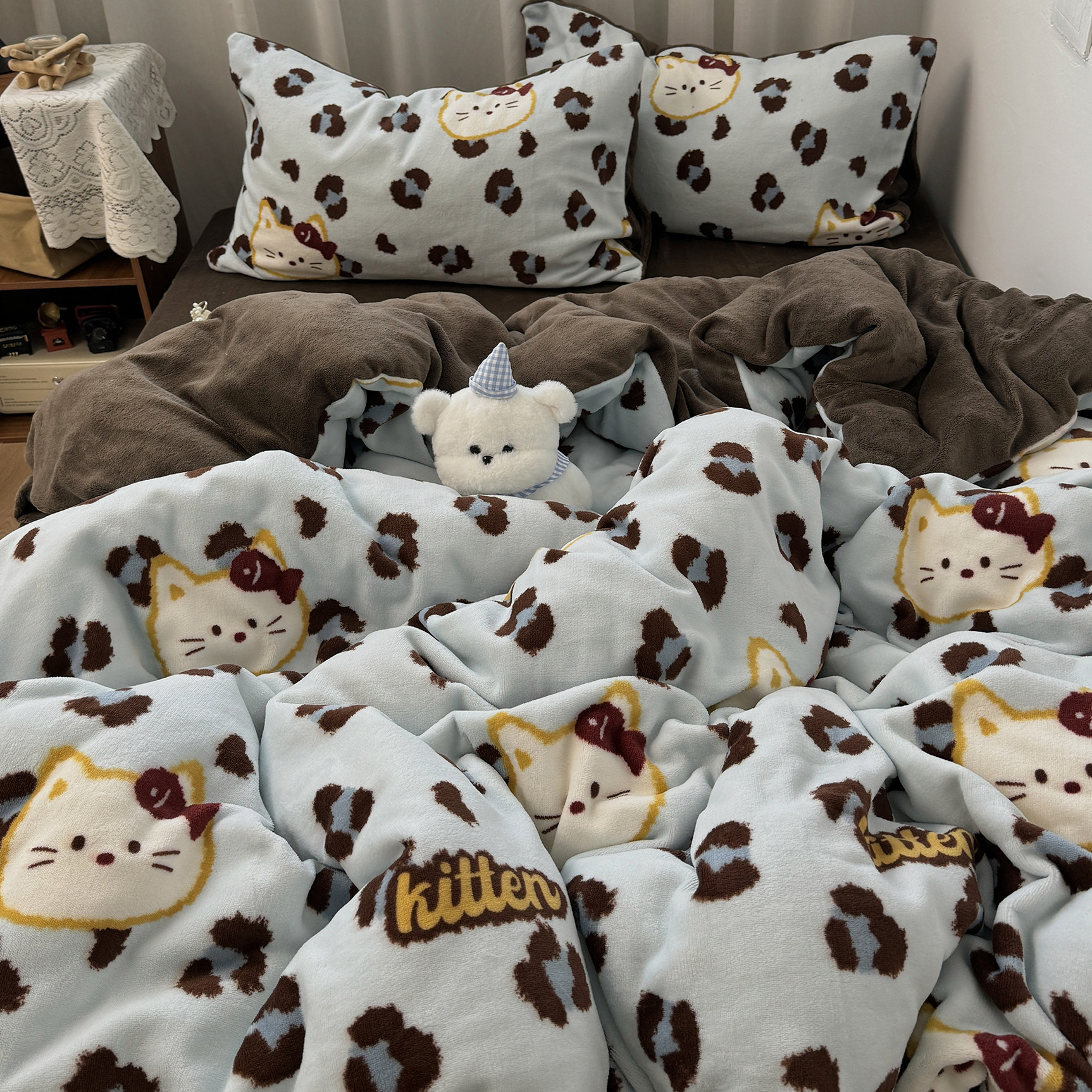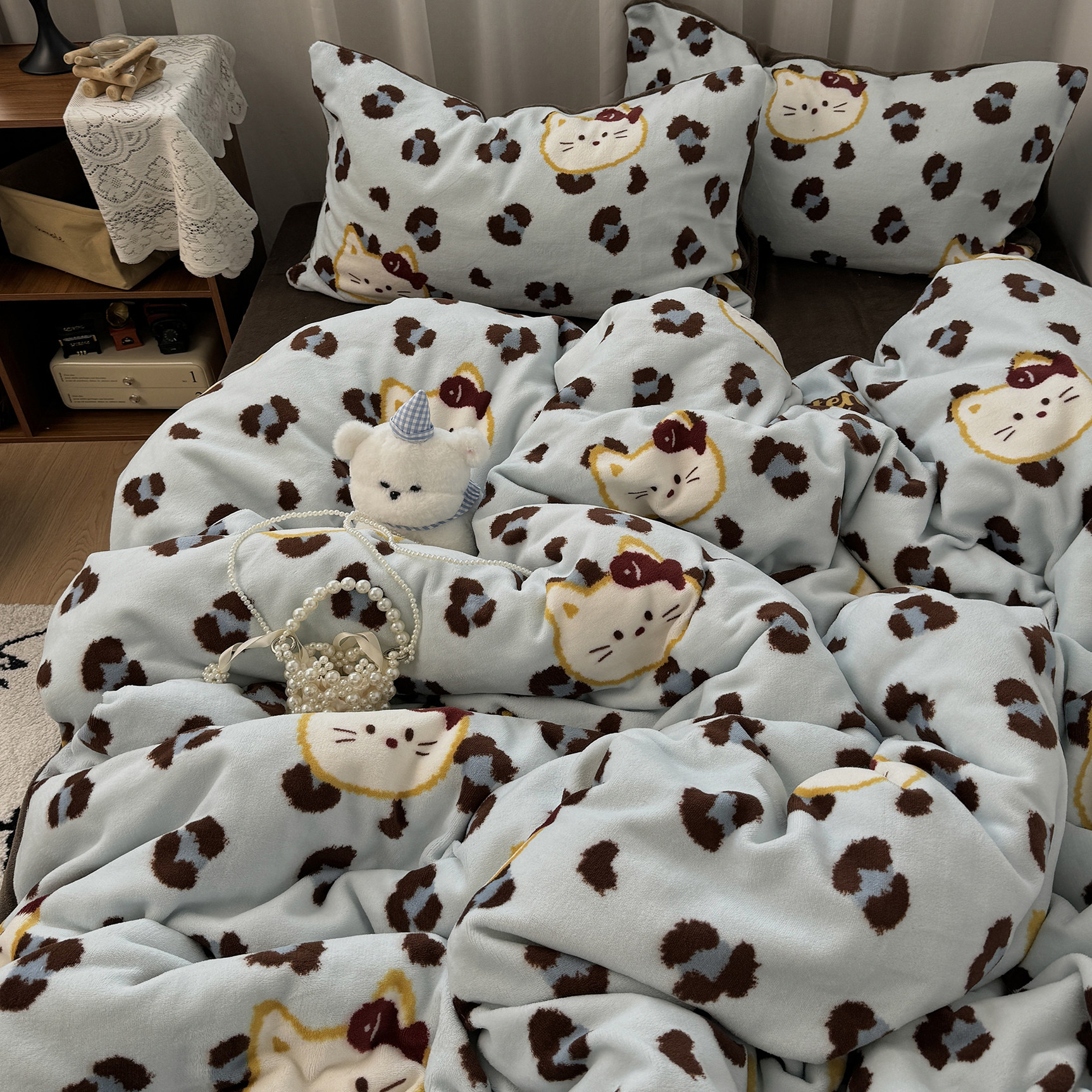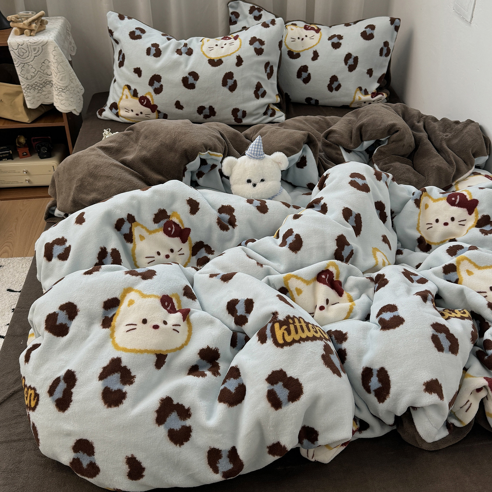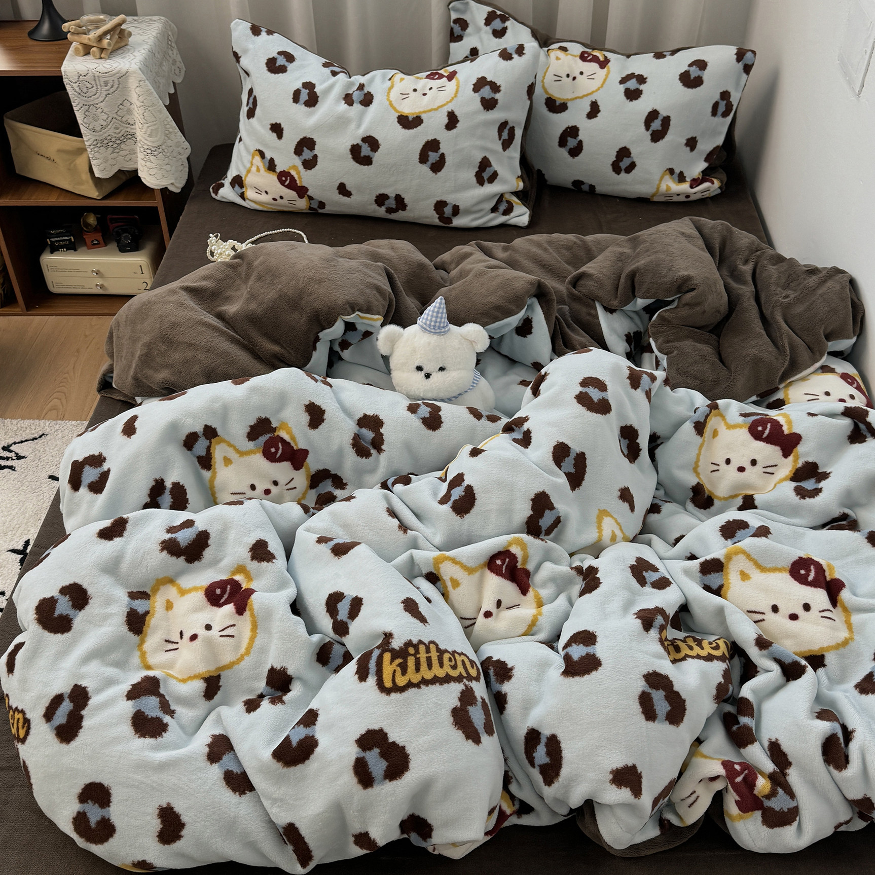 浅蓝豹纹猫猫少女心牛奶绒四件套冬季保暖舒适珊瑚绒法兰绒三件套