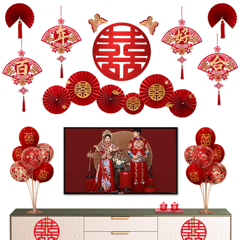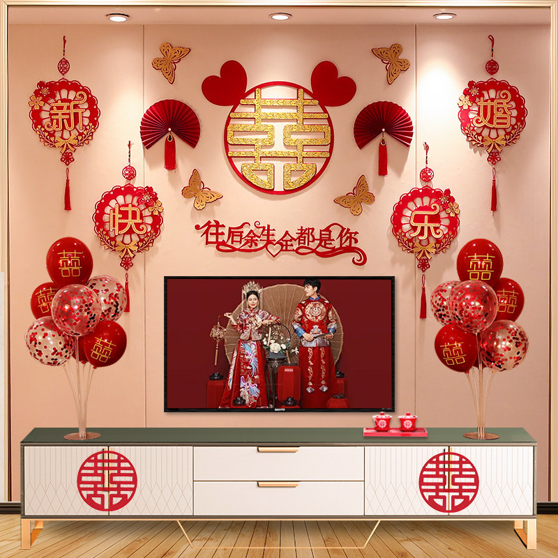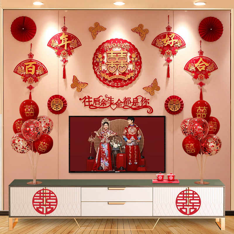 结婚电视背景墙装饰拉花套装婚房布置男方女方新房客厅喜字挂饰