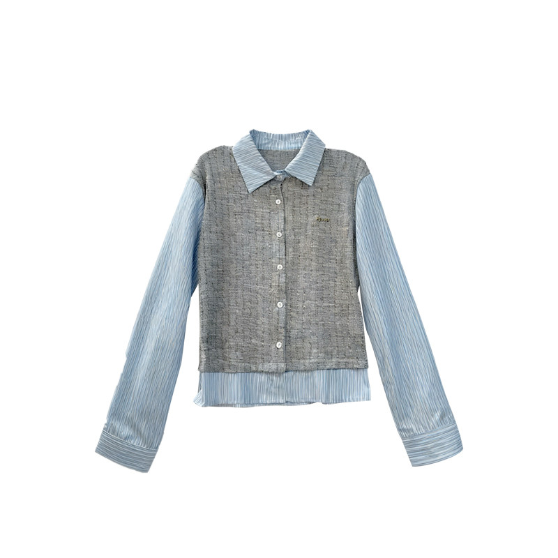 推荐理由:楠哥微胖mm学院风假两件拼接衬衫女秋冬大码修身显瘦条纹针织上衣