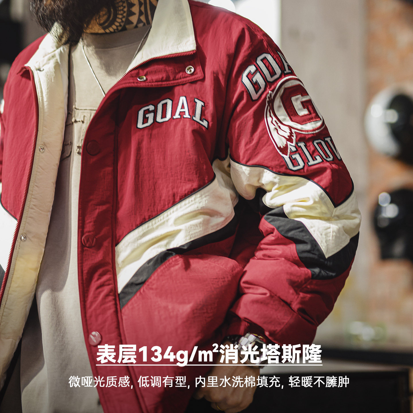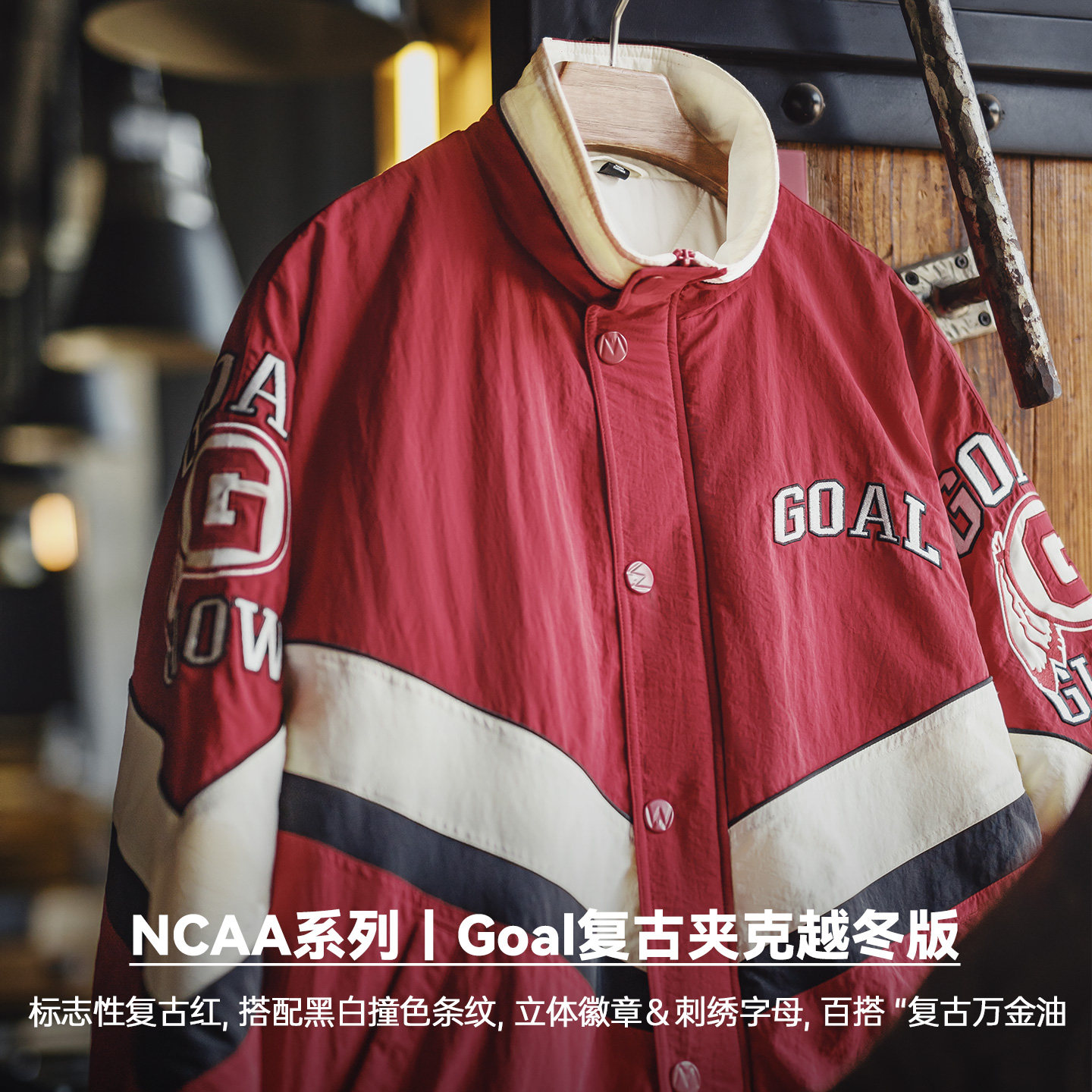 推荐理由:马登工装美式复古拼接撞色赛车夹克红色翻领加厚保暖棉服外套男冬
