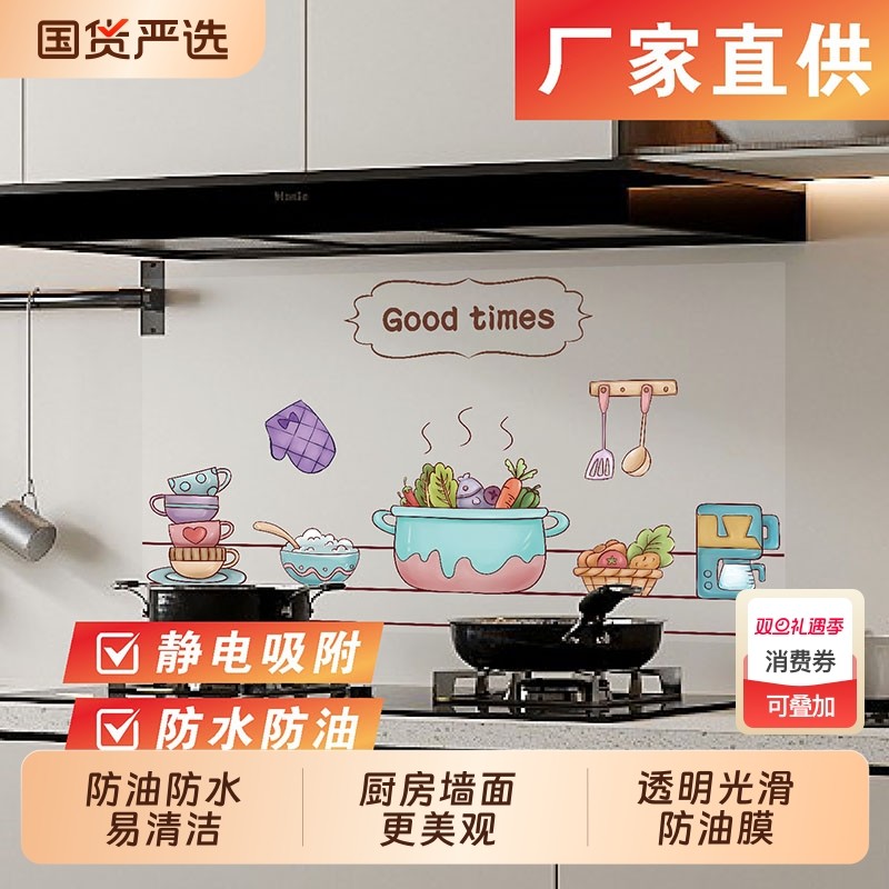 推荐理由:厨房防油贴纸防火耐高温防水油烟机透明墙面静电贴膜瓷砖灶台自粘