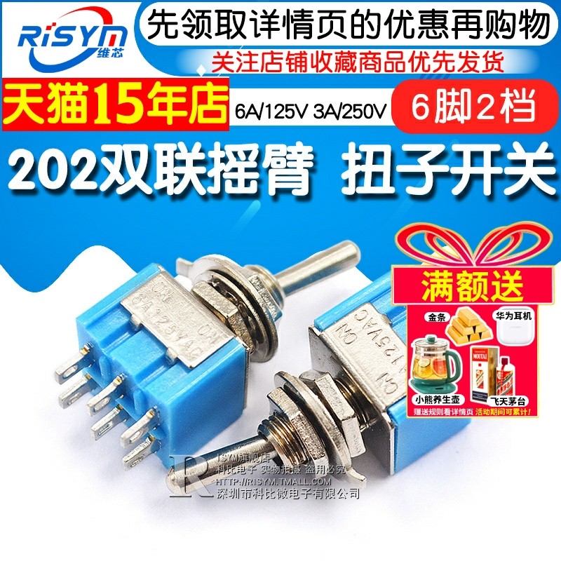 扭子开关202双联摇臂开关钮子摇头六脚二档2两档6A/125V 3A/250V