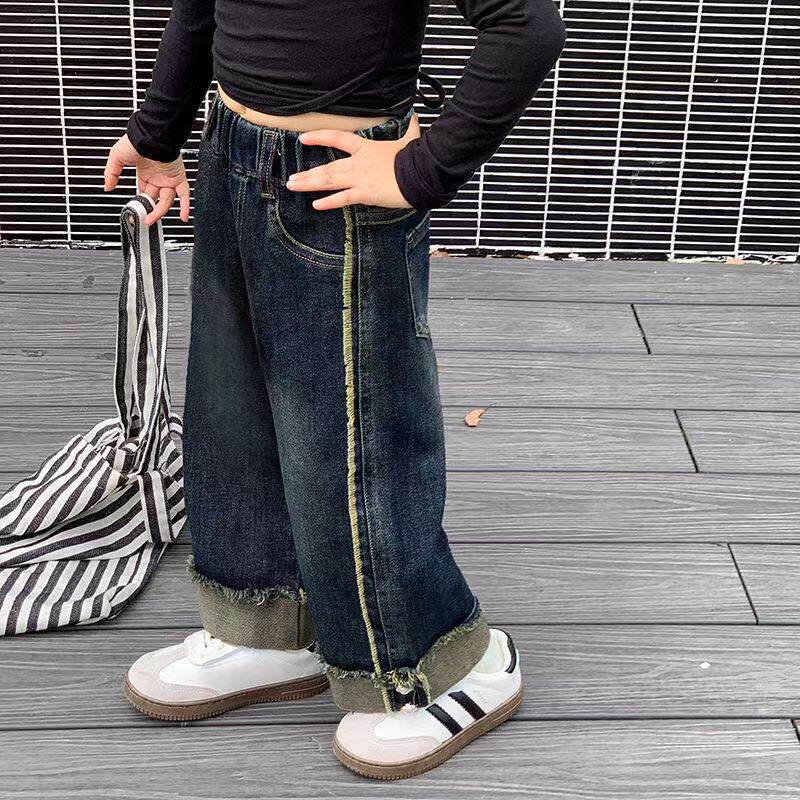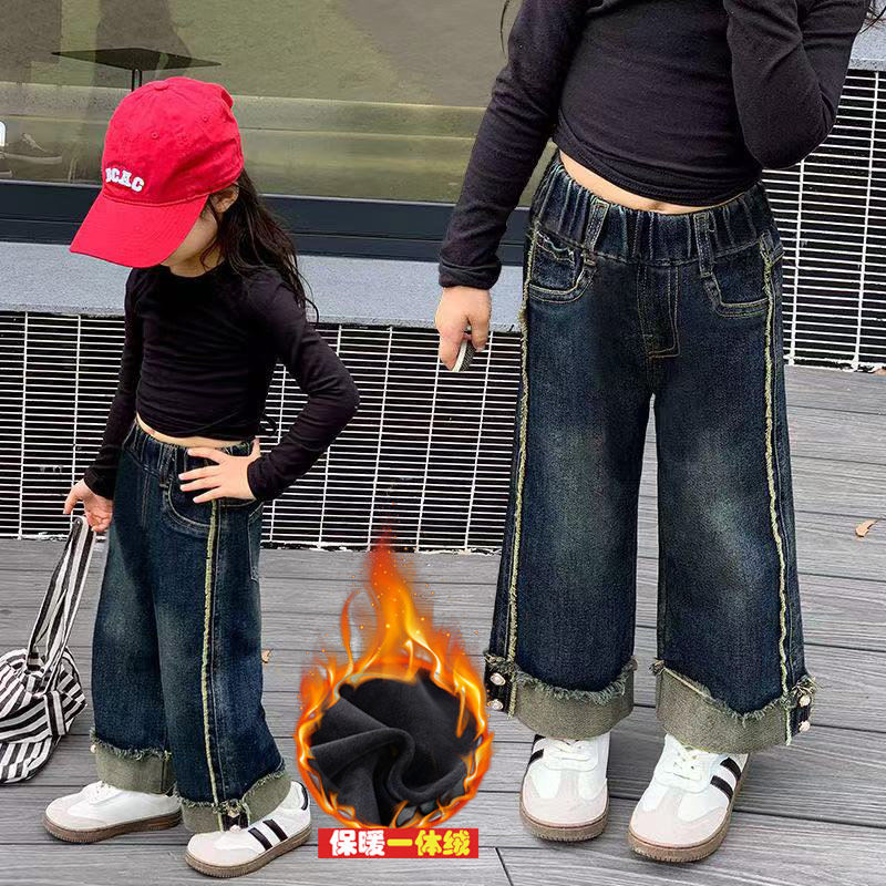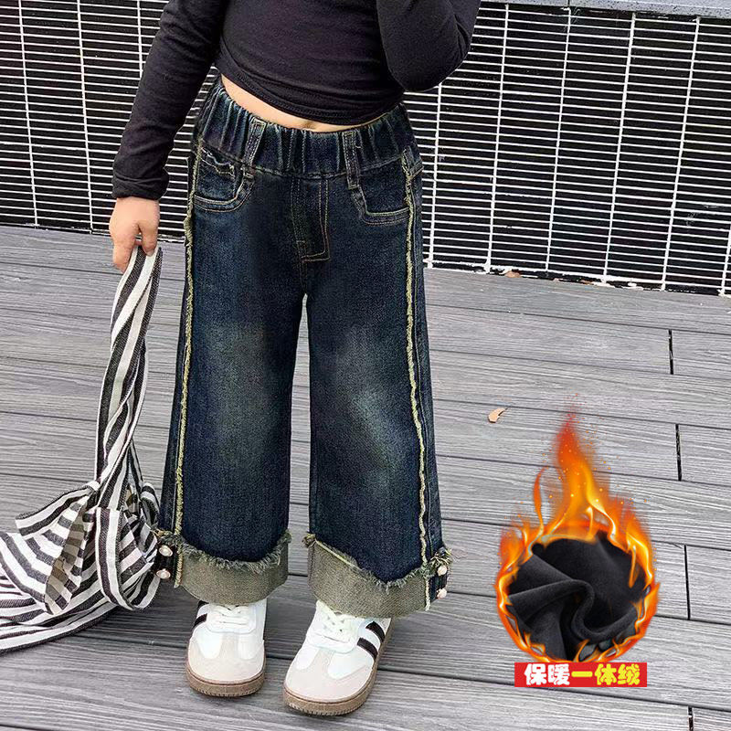 女童牛仔阔腿裤加绒一体绒新款儿童宝宝女孩宽松直筒加厚女童裤子