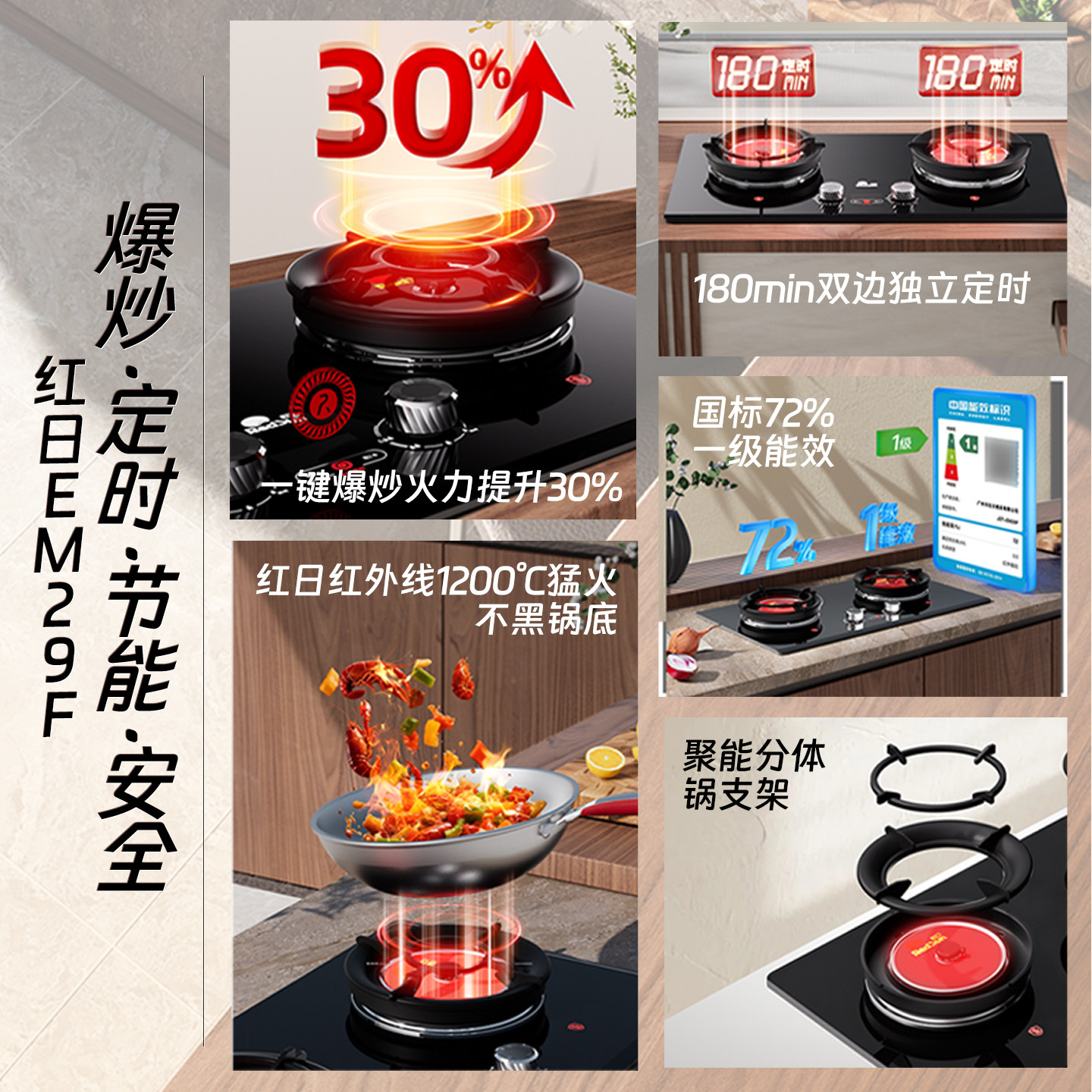 推荐理由:红日红外线燃气灶双灶一键爆炒灶72%高热效家用灶具台嵌两用EM29F