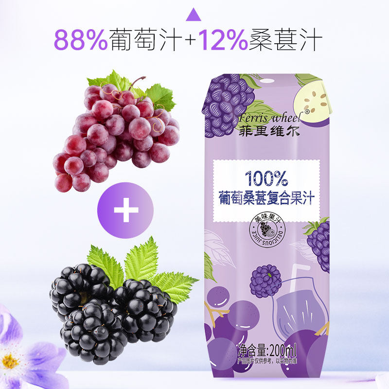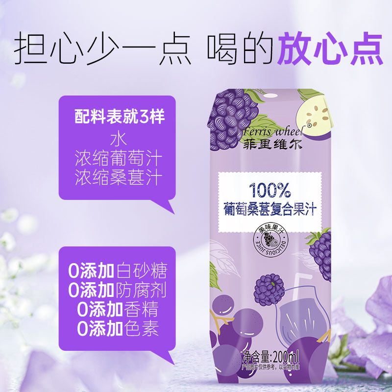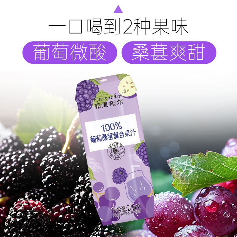 推荐理由:菲里维尔100%葡萄桑葚汁果汁饮料聚会水果饮品小瓶箱装200ml*12瓶