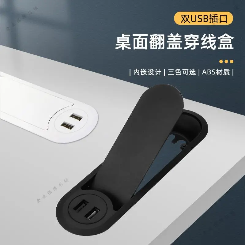 办公桌面带USB穿线盒 长方形线孔盖电脑桌会议桌翻盖过线盒走线盒