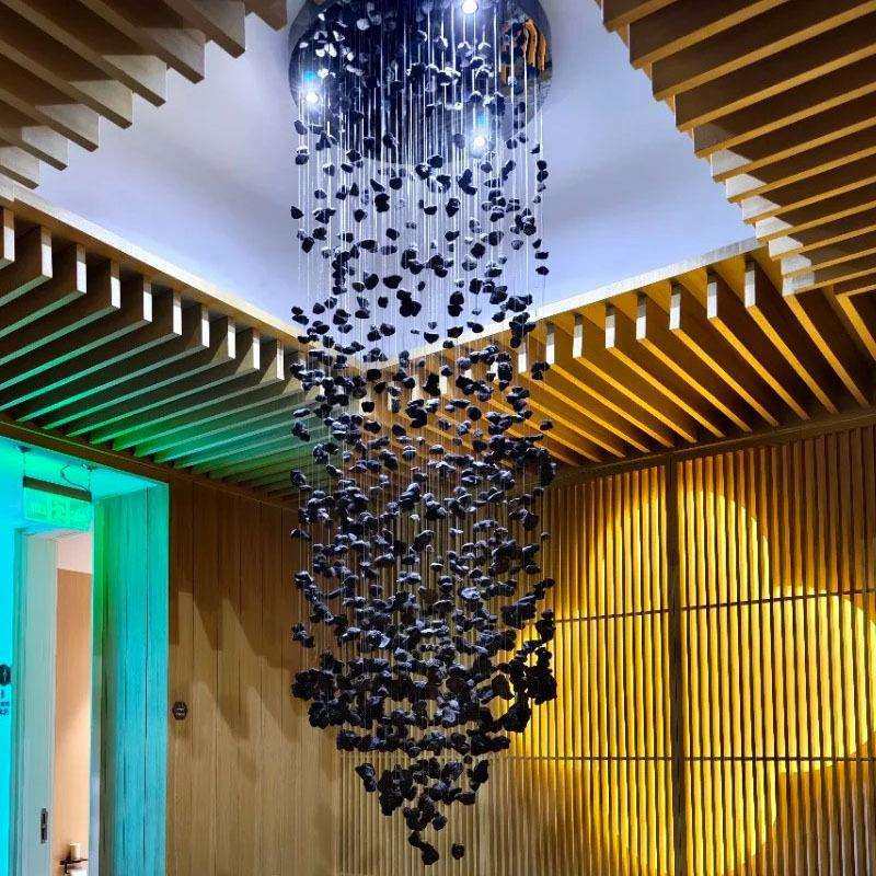推荐理由:轻奢酒店大堂灯黑色石头子长吊灯LOFT复式住宅别墅楼梯间灯中空灯