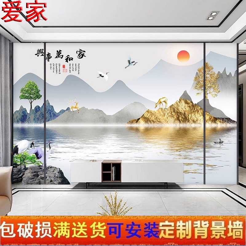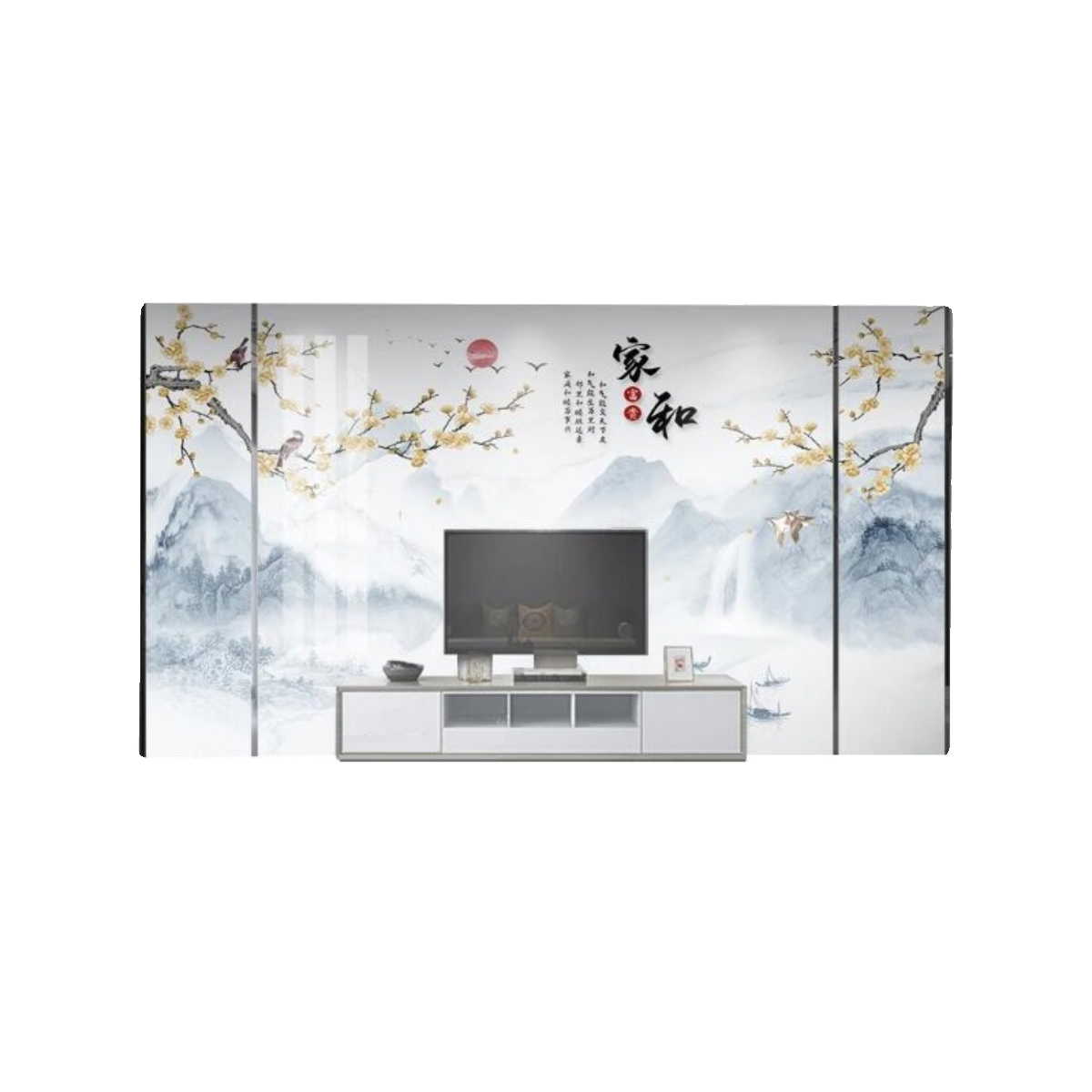 岩板电视背景墙3D雕刻客厅新中式微晶石山水花鸟大理石影视墙瓷砖