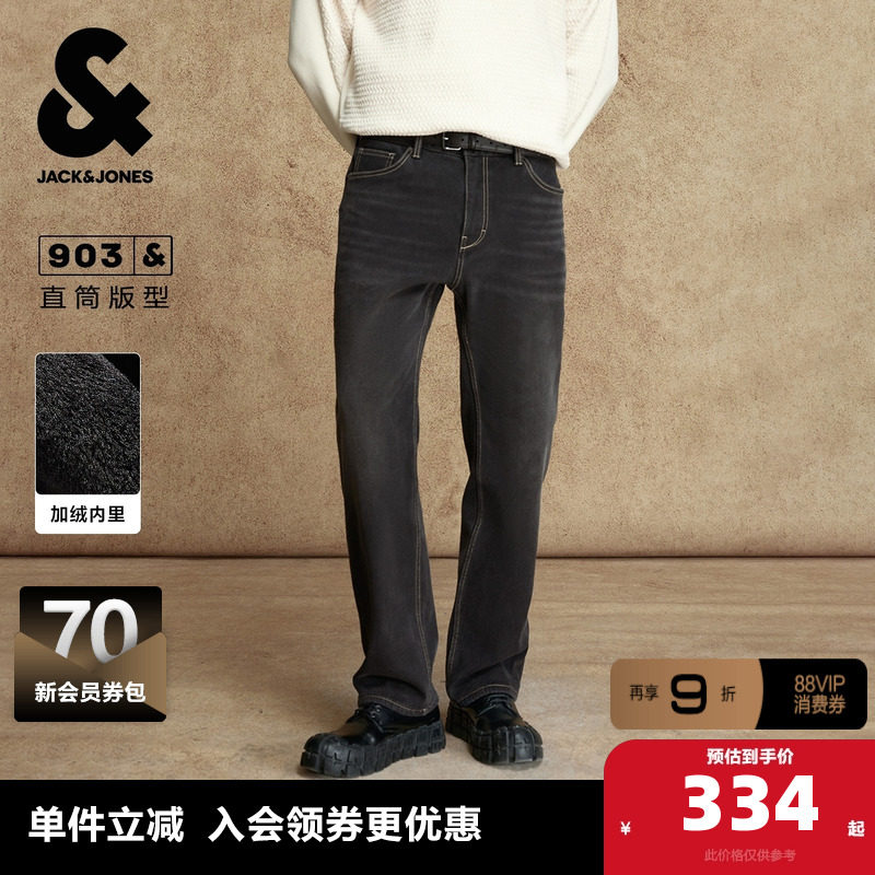 杰克琼斯奥特莱斯男装牛仔裤秋冬季裤身明线加绒水洗宽松直筒裤子