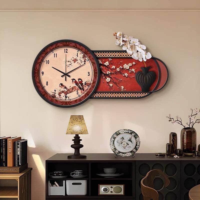 中古风餐厅装饰画中式复古客厅钟表挂画横版餐桌墙面壁画挂墙时钟