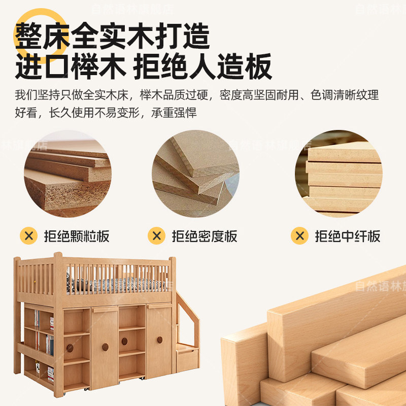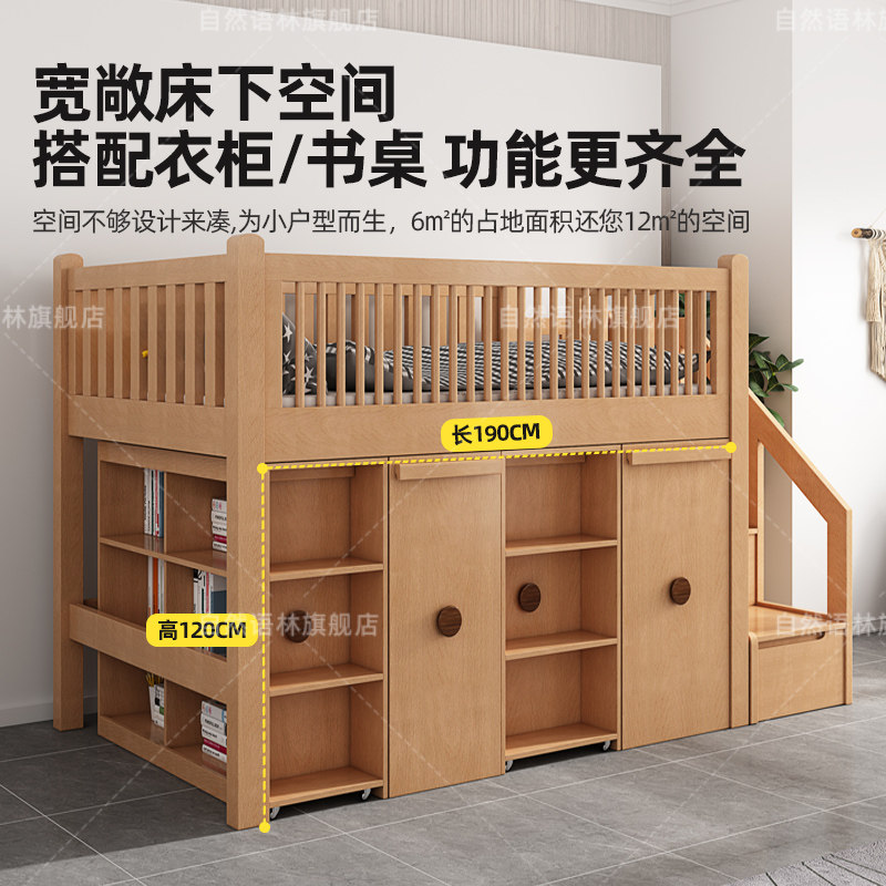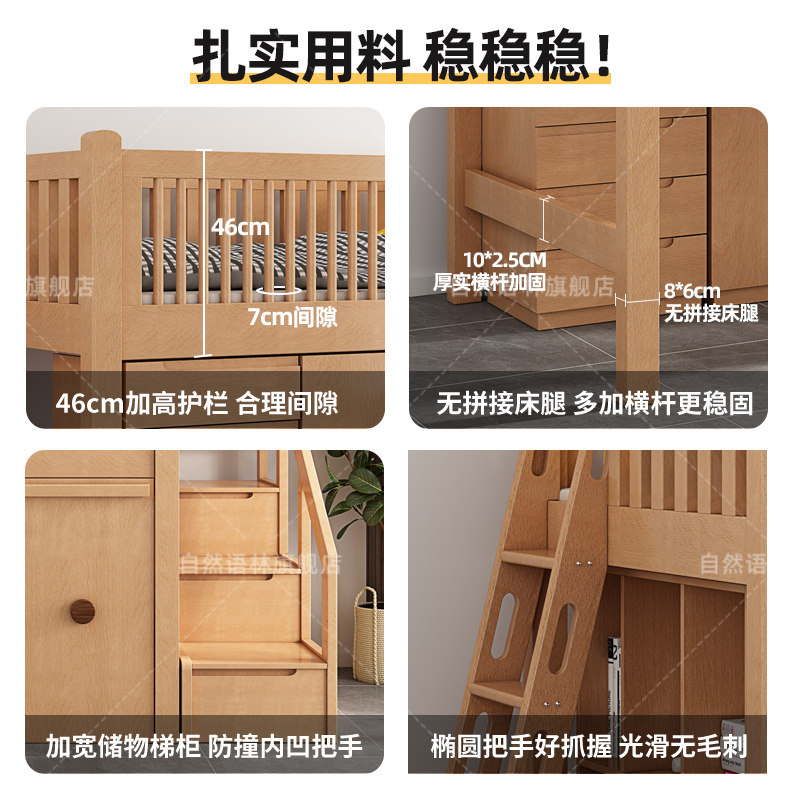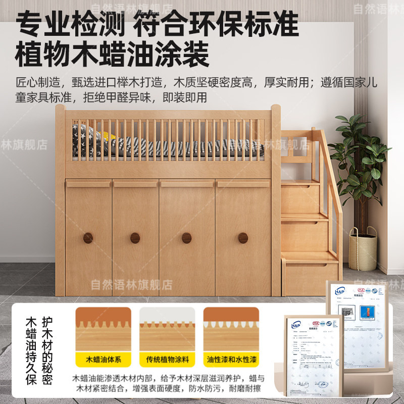 榉木实木儿童半高床1.5米1.2m男孩女孩儿多功能储物床儿童房护栏