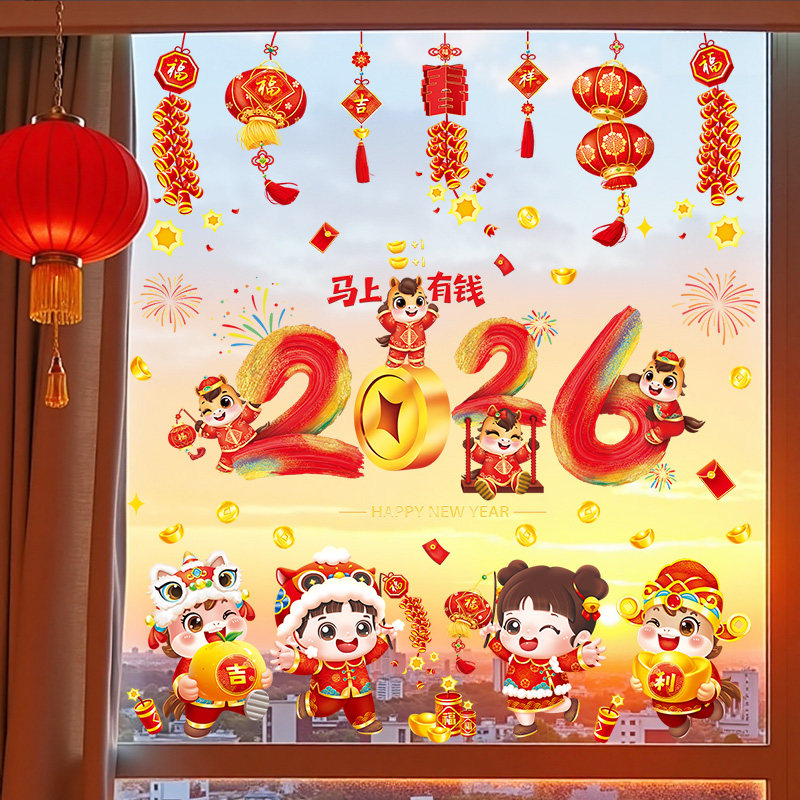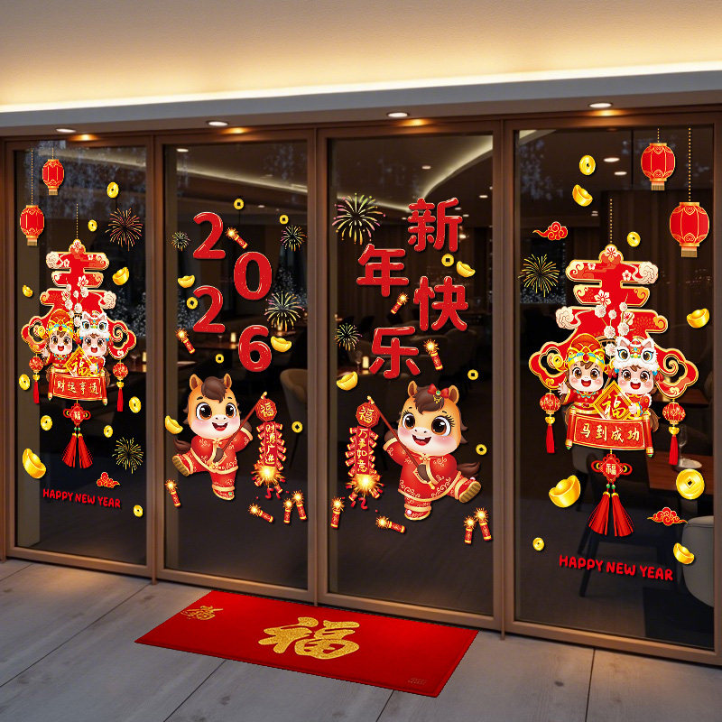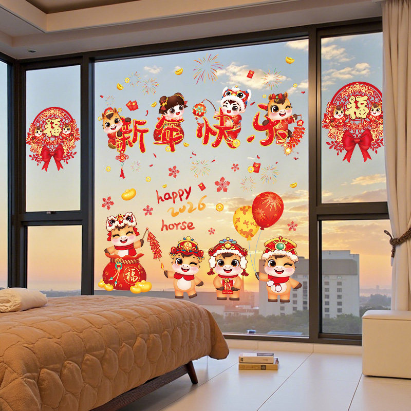 2026马年新年春节装饰静电贴窗贴玻璃门贴纸窗花贴画元旦过年布置