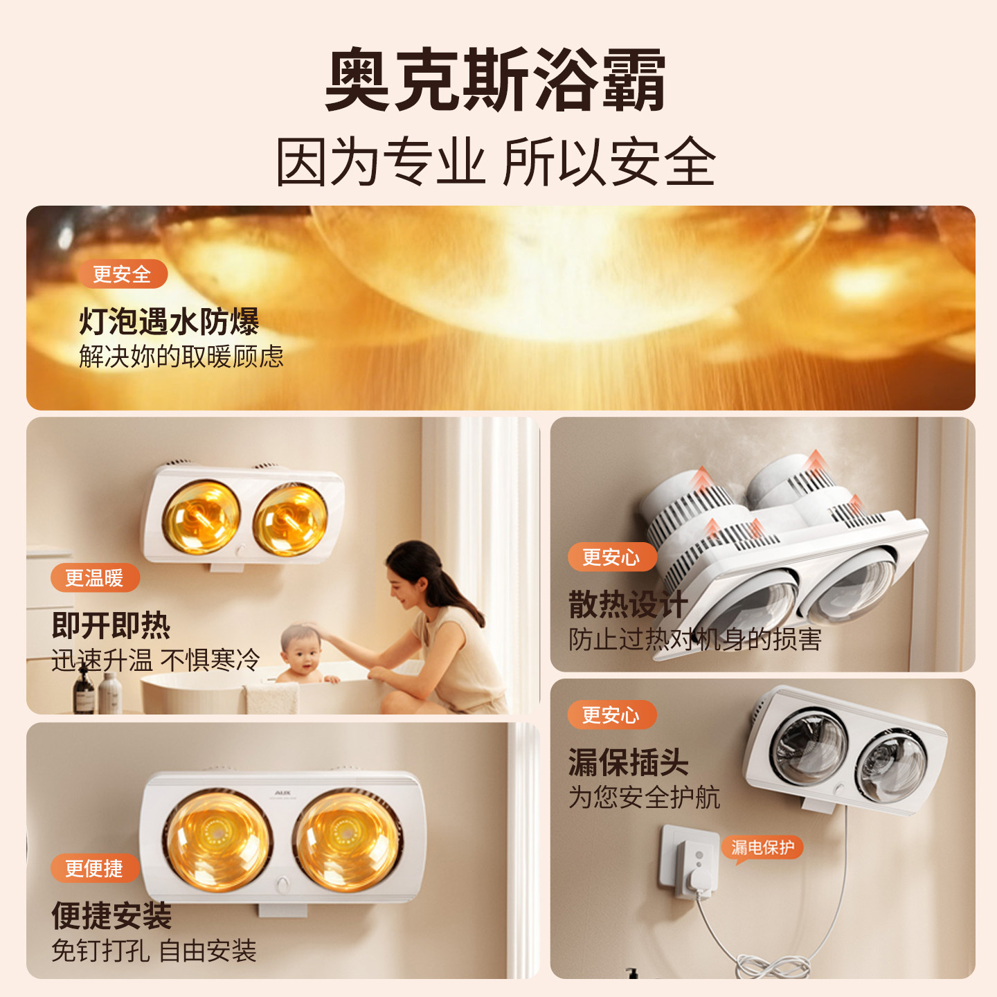 推荐理由:奥克斯壁挂式浴霸卫生间取暖灯暖风暖一体防水耐用灯泡浴室免打孔