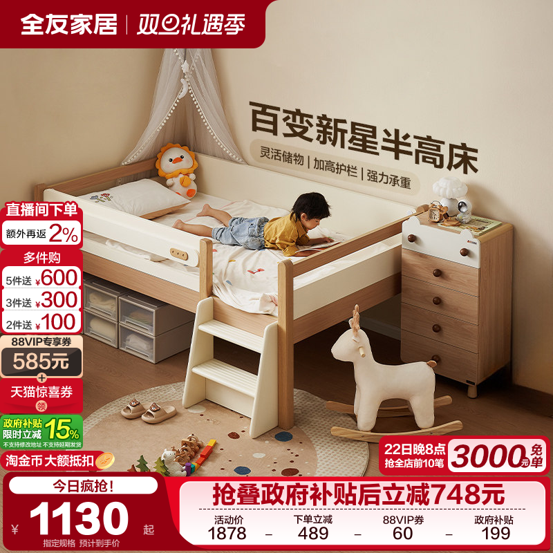 政府补贴全友家居2025新款原木风儿童半高床小户型卧室男孩单人床