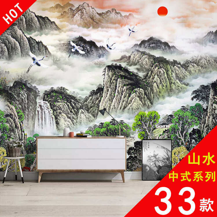 中国山水画中式大型自粘壁画贴纸可移除墙贴电视背景墙客厅卧室
